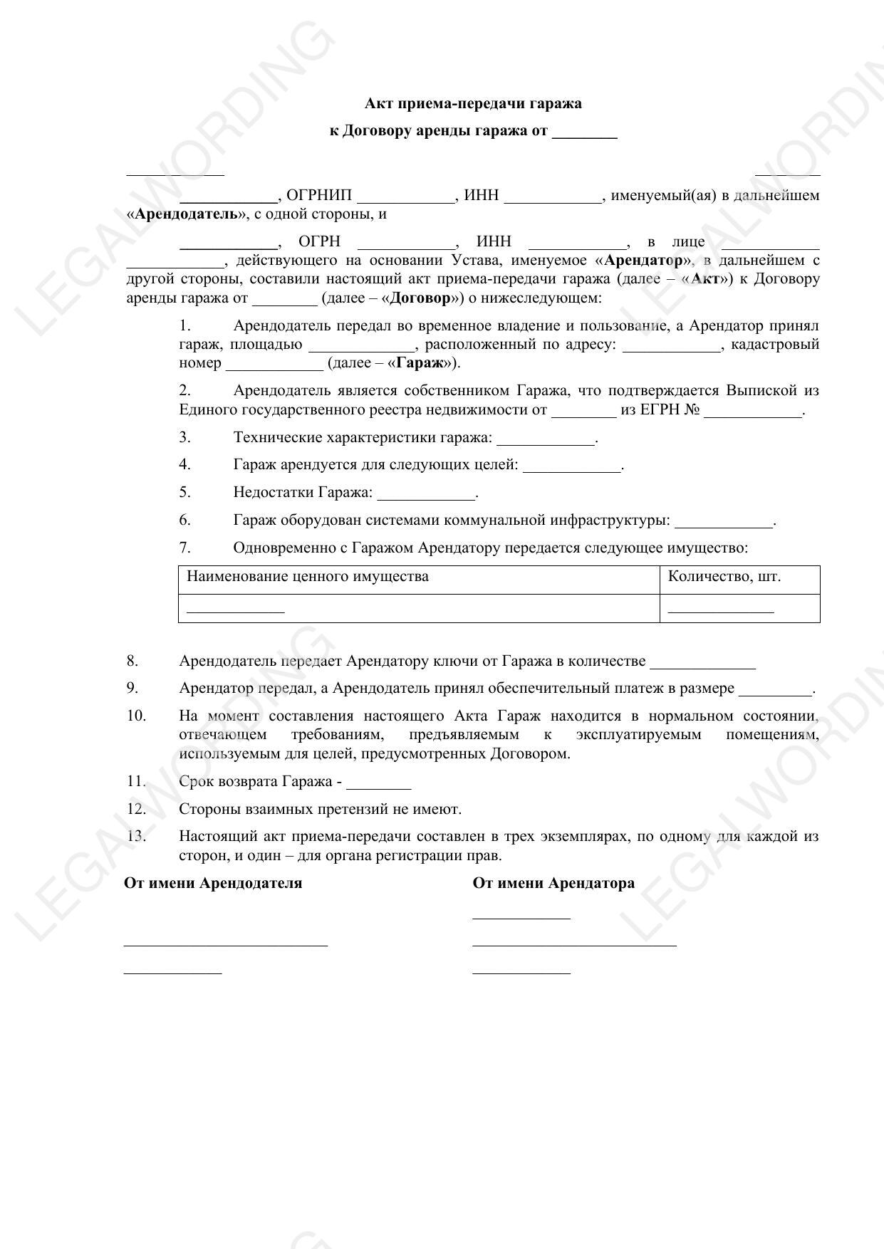 Этот акт регламентирует процесс передачи гаража от арендодателя арендатору и содержит все необходимые сведения для фиксирования данного факта, а также договоренности сторон касательно состояния и использования гаража