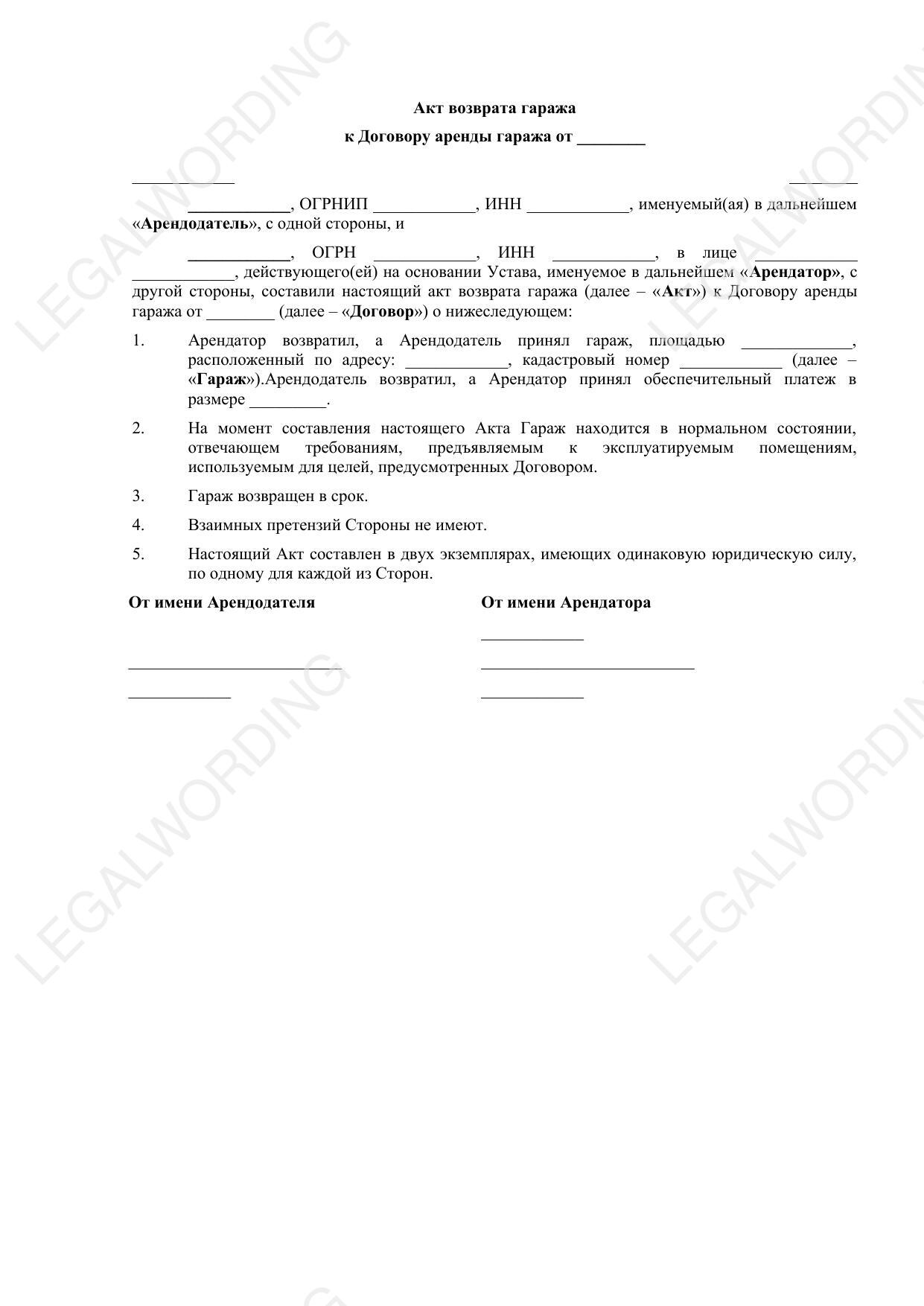 Этот договор регулирует порядок и условия возврата гаража, состояние помещения на момент возврата, а также финансовые расчеты между арендодателем и арендатором