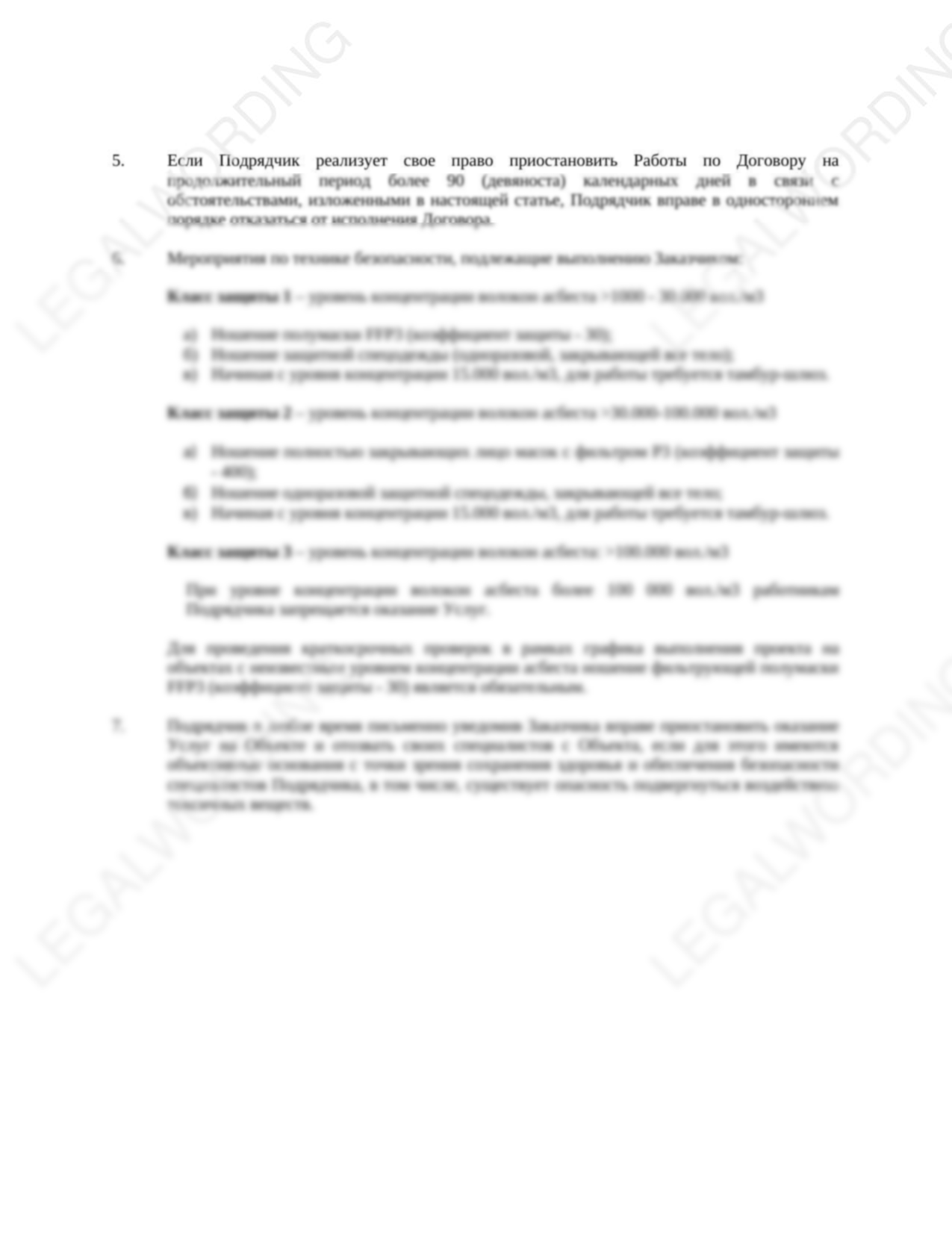 При определенных превышенных уровнях концентрации асбеста заказчик обязан обеспечить работников подрядчика средствами индивидуальной защиты соответствующих определенному классу опасности в зависимости от степени концентрации асбеста.