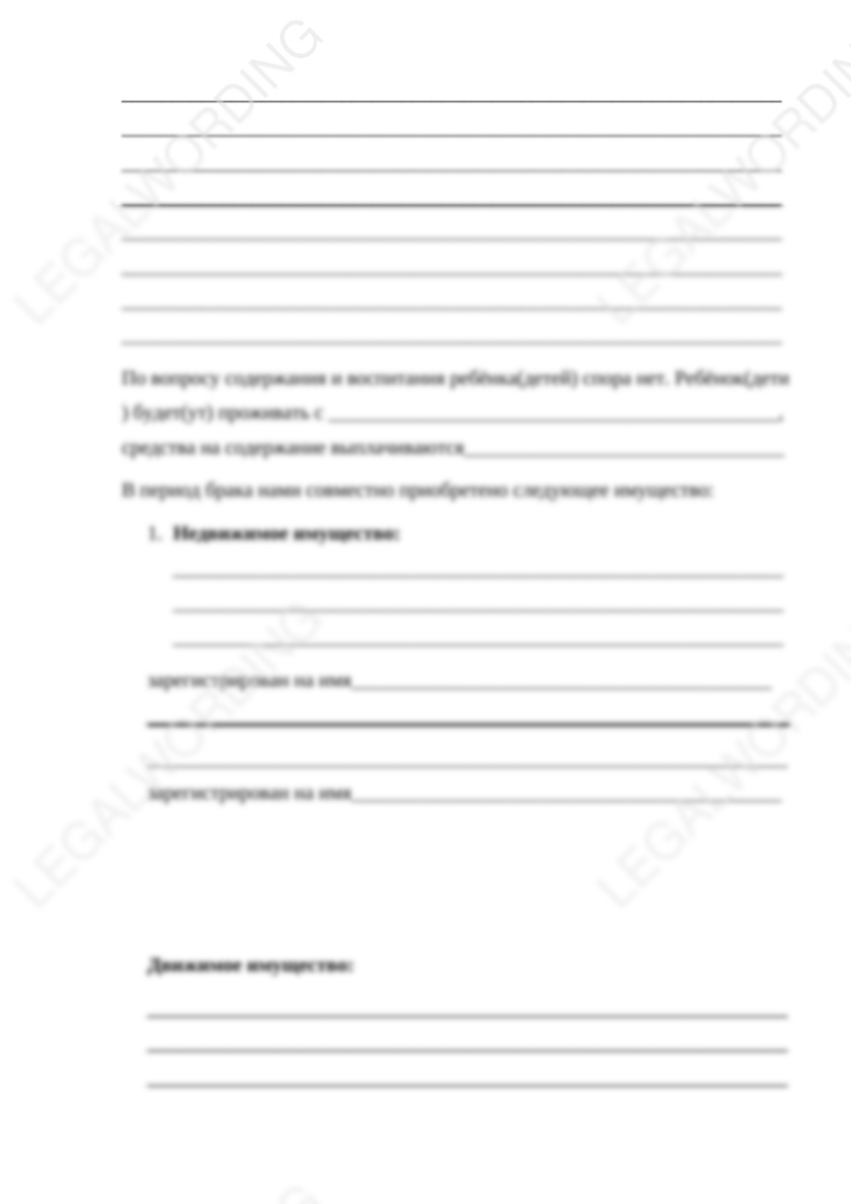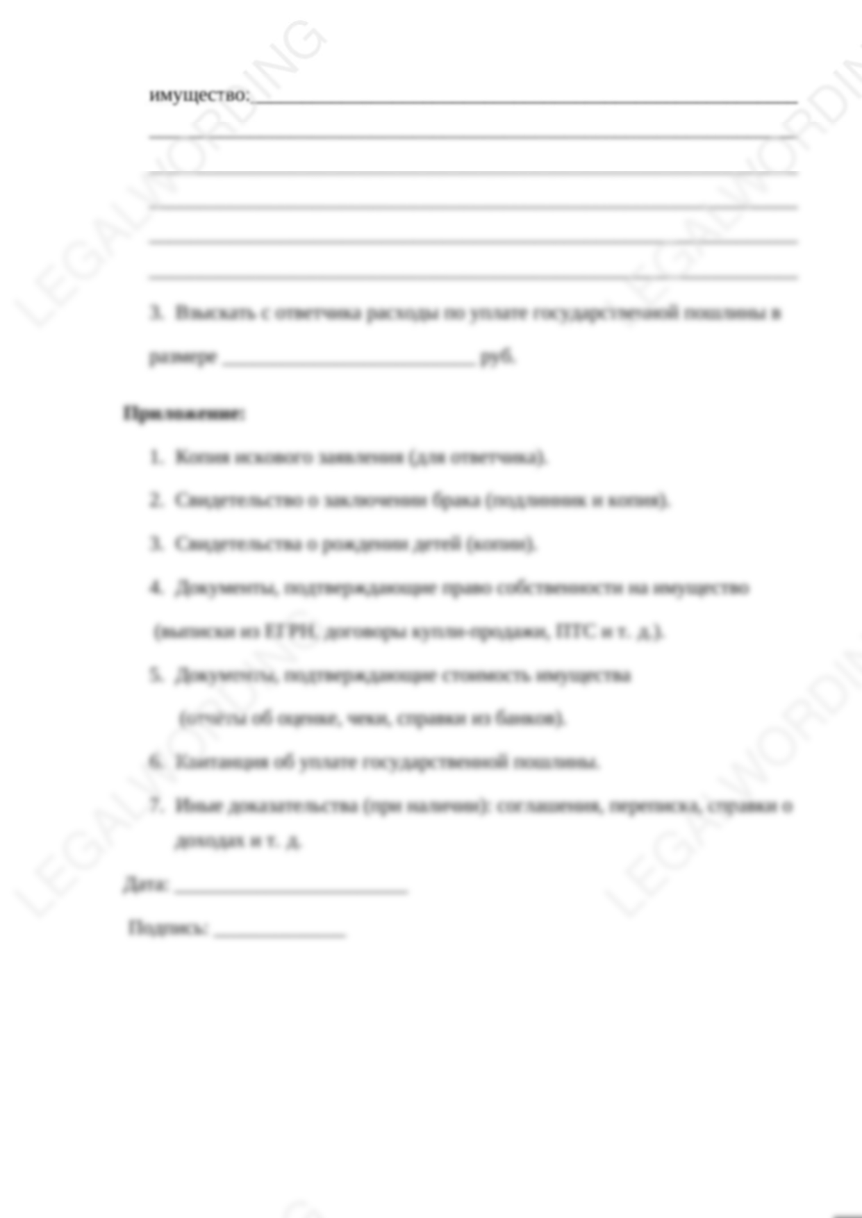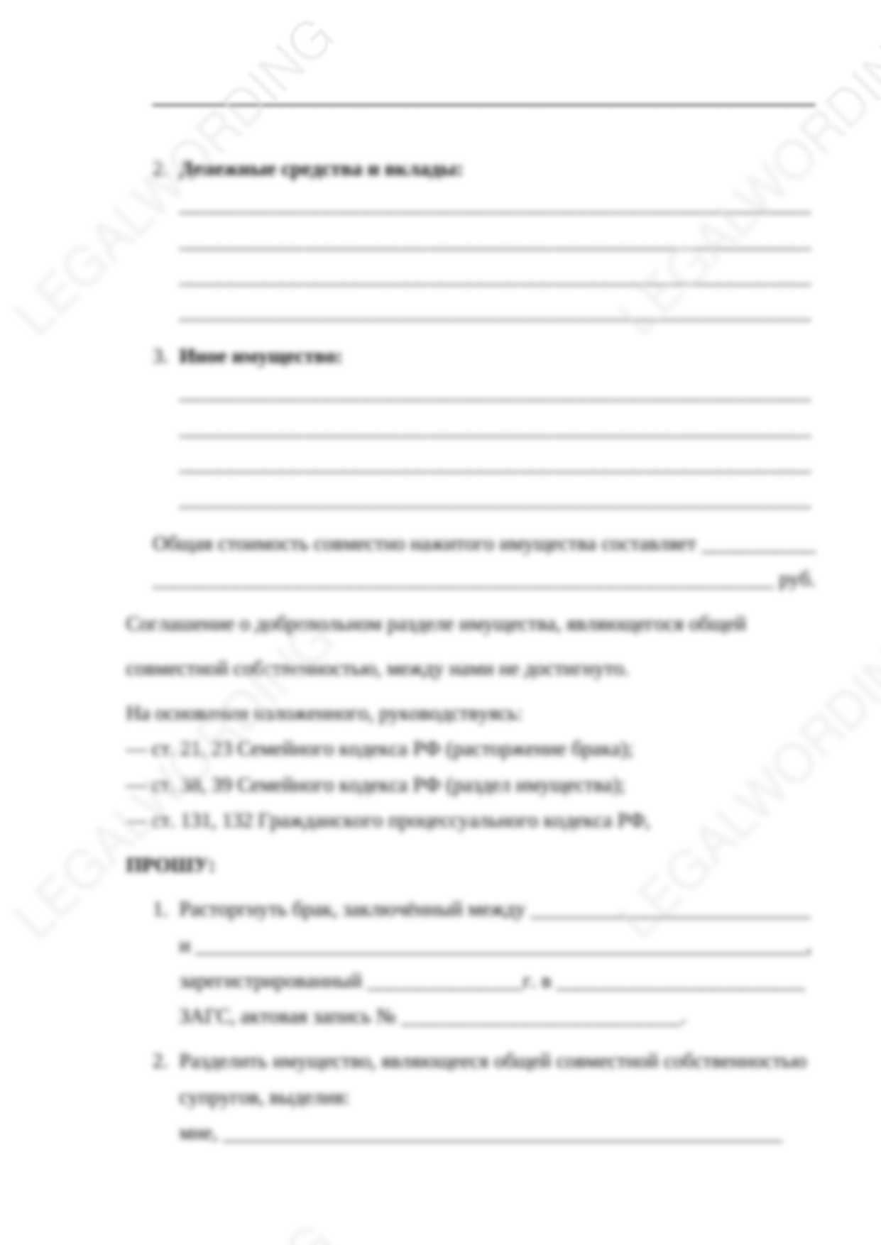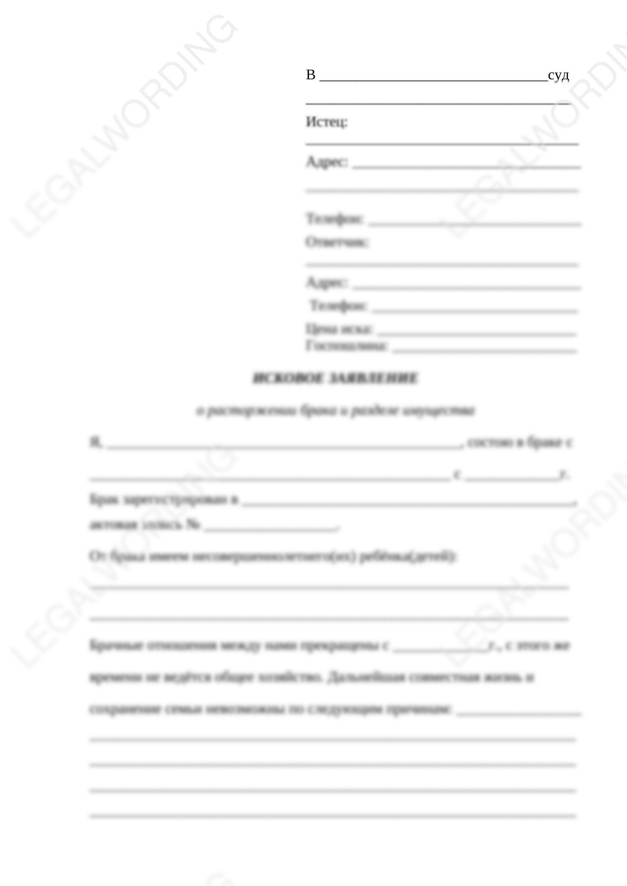 Готовый бланк искового заявления о расторжении брака и разделе совместно нажитого имущества при отсутствии спора о месте жительства детей. Содержит всю необходимую информация, соответствует требованию закона к таким заявлениям (ГПК РФ). Необходимо лишь вписать или впечатать свои личные данные и подать в суд.
