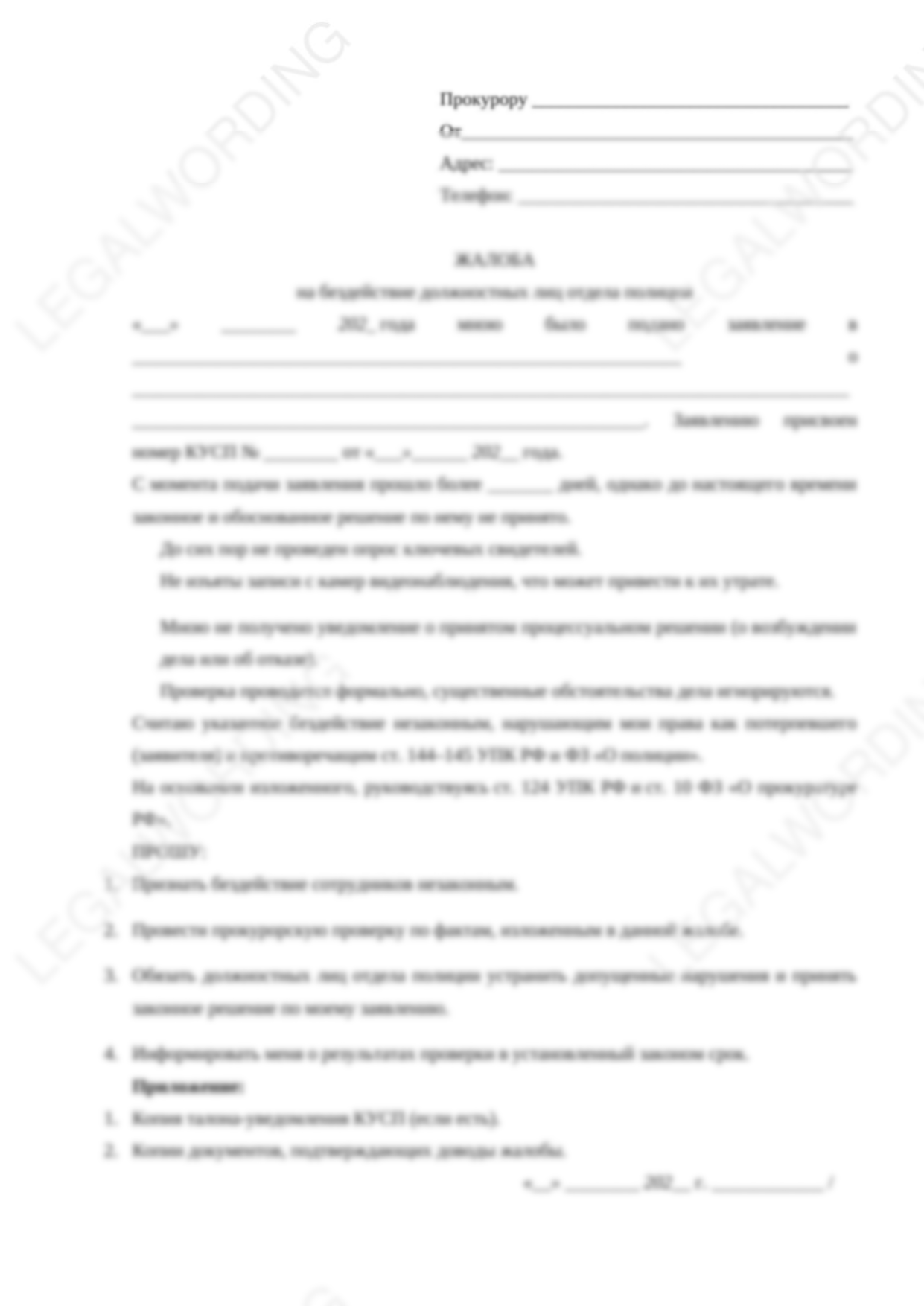 Бланк жалобы прокурору на бездействие полиции в РФ является восстребованным тк помогает ускорить рассмотрение заявления о правонарушении. Готов к заполнению, впишите свои данные и направьте прокурору через Госуслуги, почтой, вручите на личном приеме. Удачи!