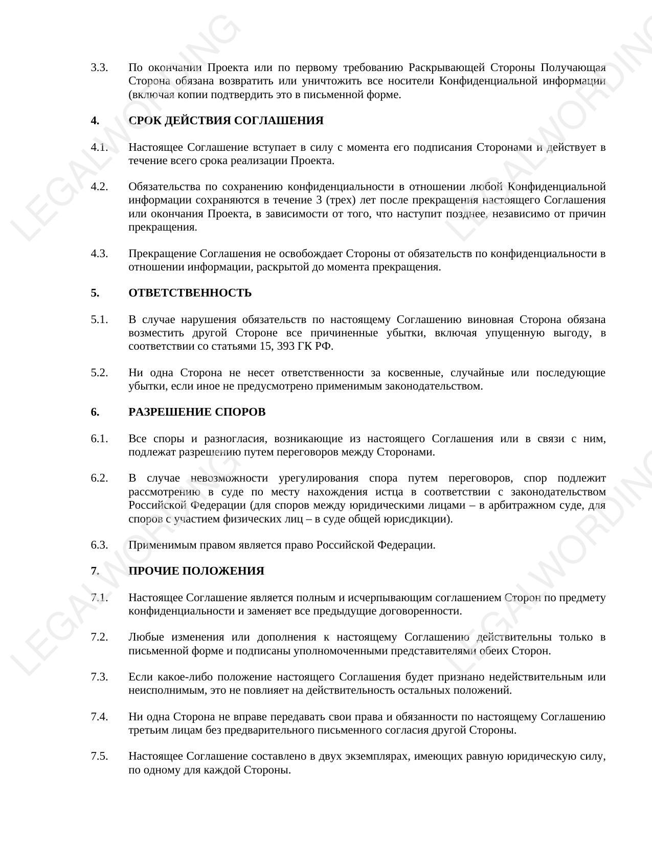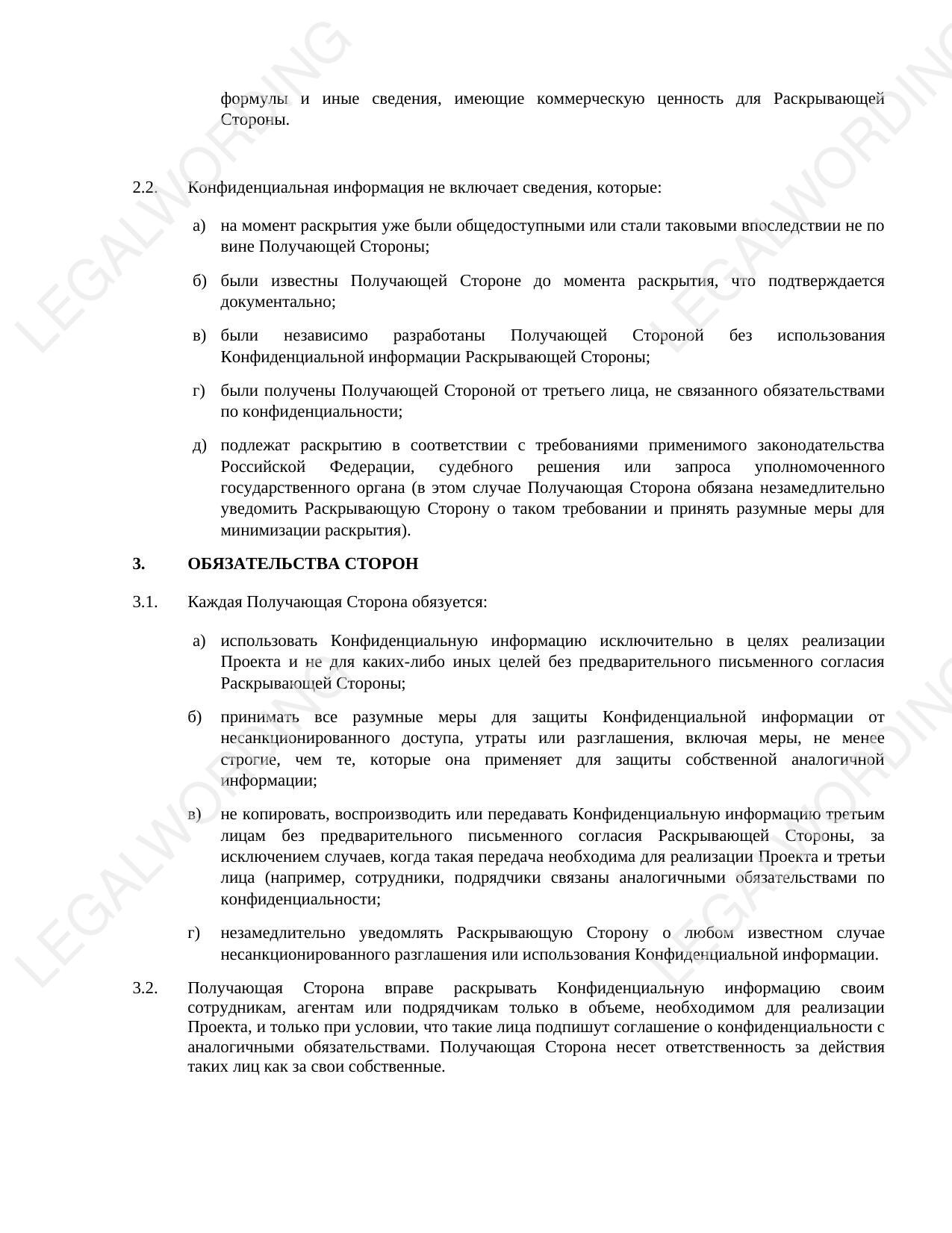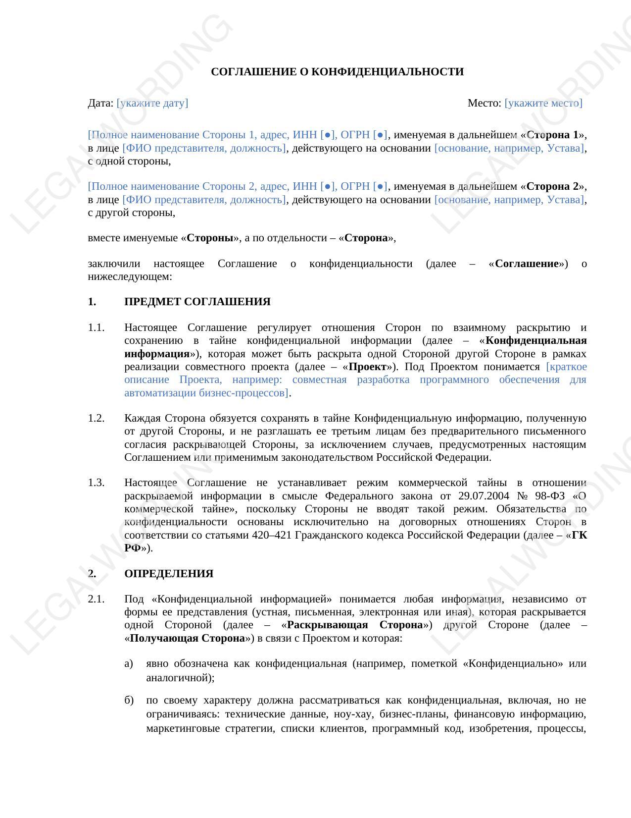 Это соглашение о конфиденциальности представляет собой договорный шаблон, предназначенный для регулирования отношений между сторонами, которые обмениваются конфиденциальной информацией в рамках совместного проекта, но не вводят формальный режим коммерческой тайны в соответствии с Федеральным законом № 98-ФЗ.