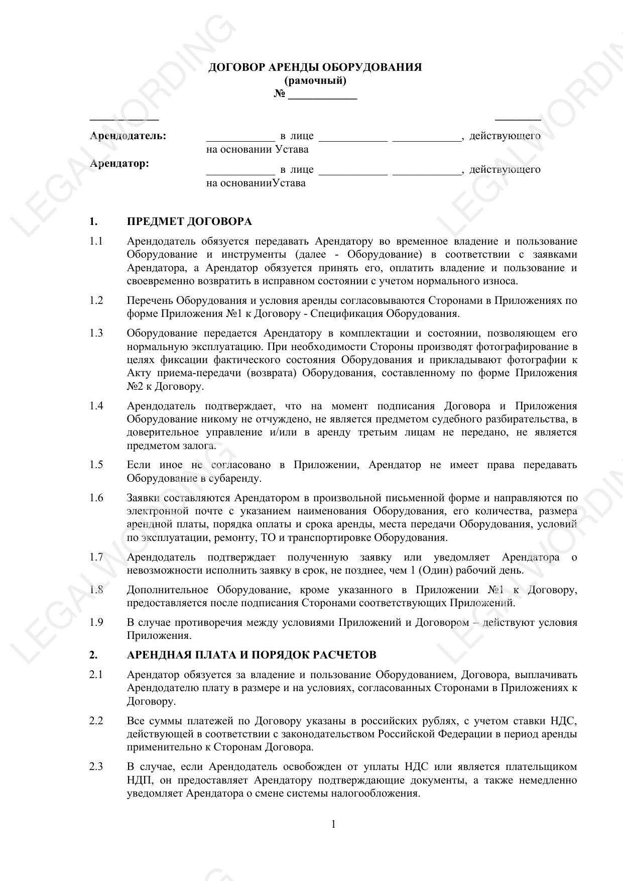 Договор аренды оборудования (рамочный) - превью страницы 1