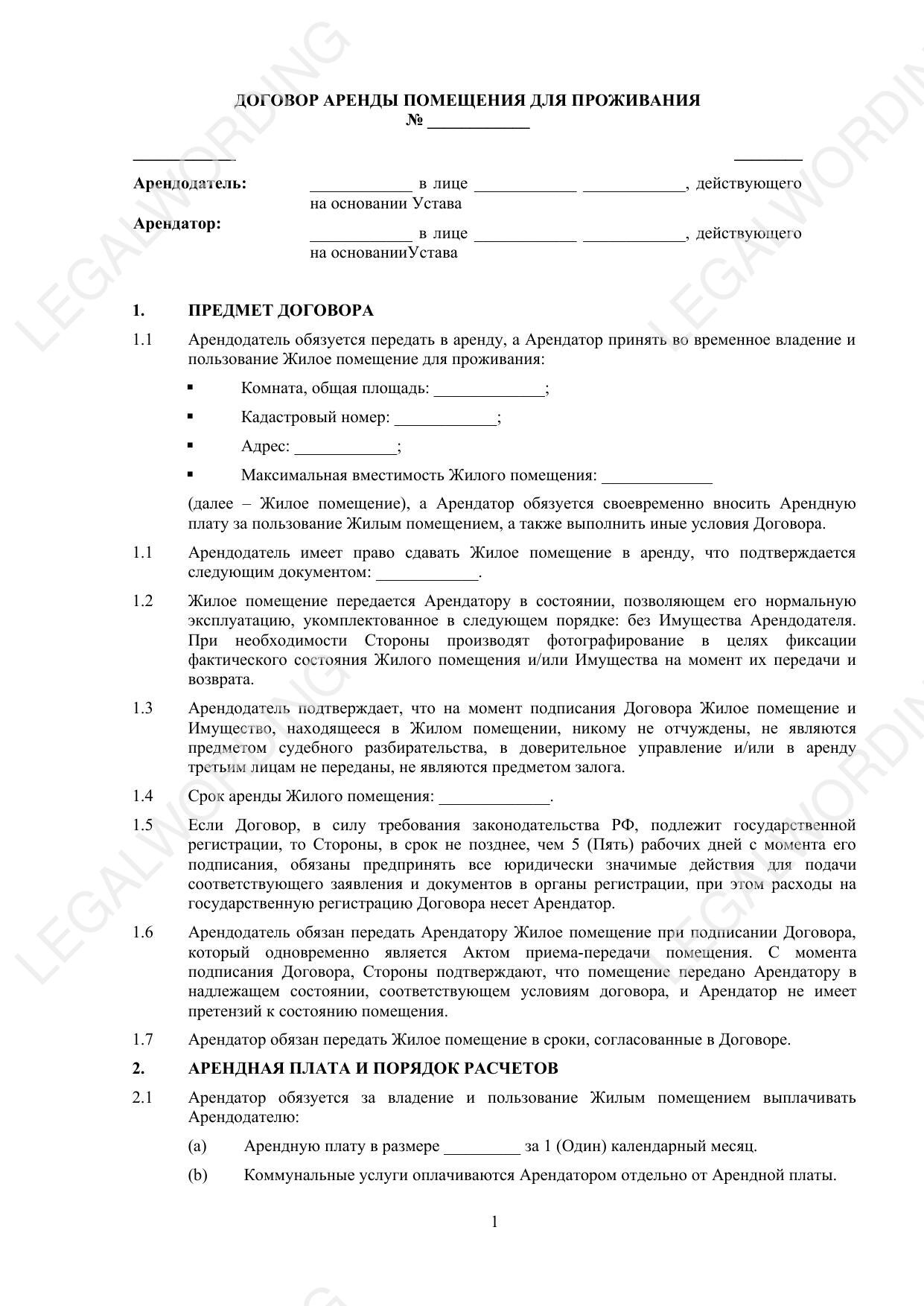 Договор аренды помещения для проживания