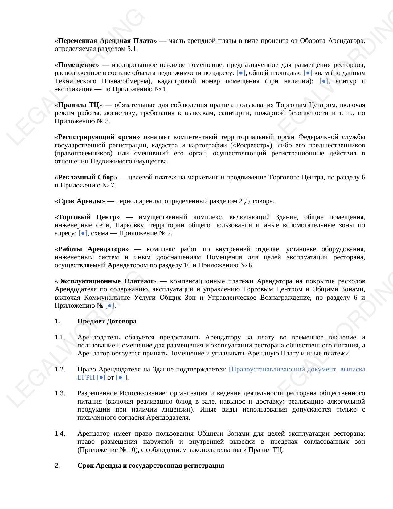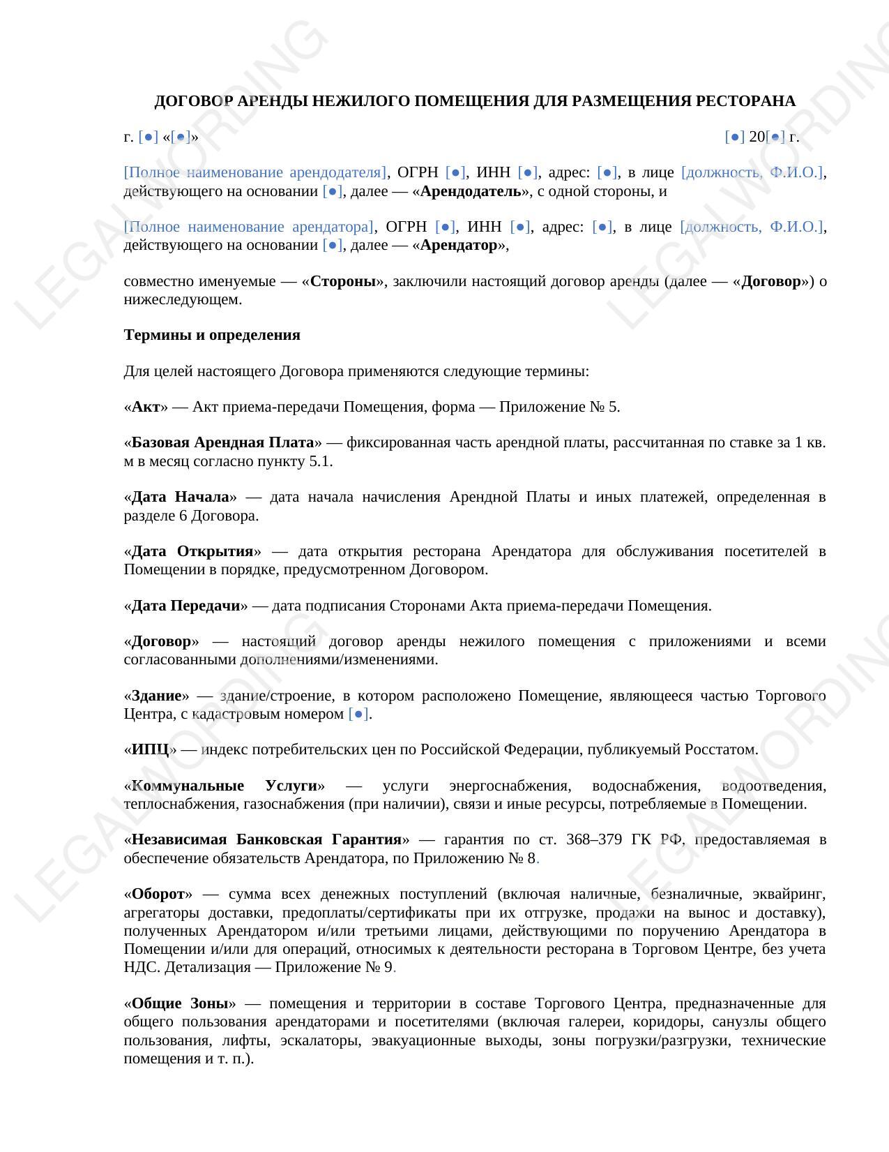 Перед вами подробный договор аренды нежилого помещения для размещения ресторана в составе торгового центра или аналогичного коммерческого объекта. Документ разработан для ситуаций, когда сторонам важно заранее и максимально подробно урегулировать все ключевые элементы арендных отношений: предмет и разрешенное использование, порядок передачи и возврата помещения, сроки и условия регистрации в ЕГРН, платежную модель, правила эксплуатации, требования к инженерии и работам арендатора, контроль оборота, ответственность и основания для расторжения. Это решение подходит для крупных и «дорогих» площадей, а договор должен закрывать большинство типовых конфликтов до их возникновения.