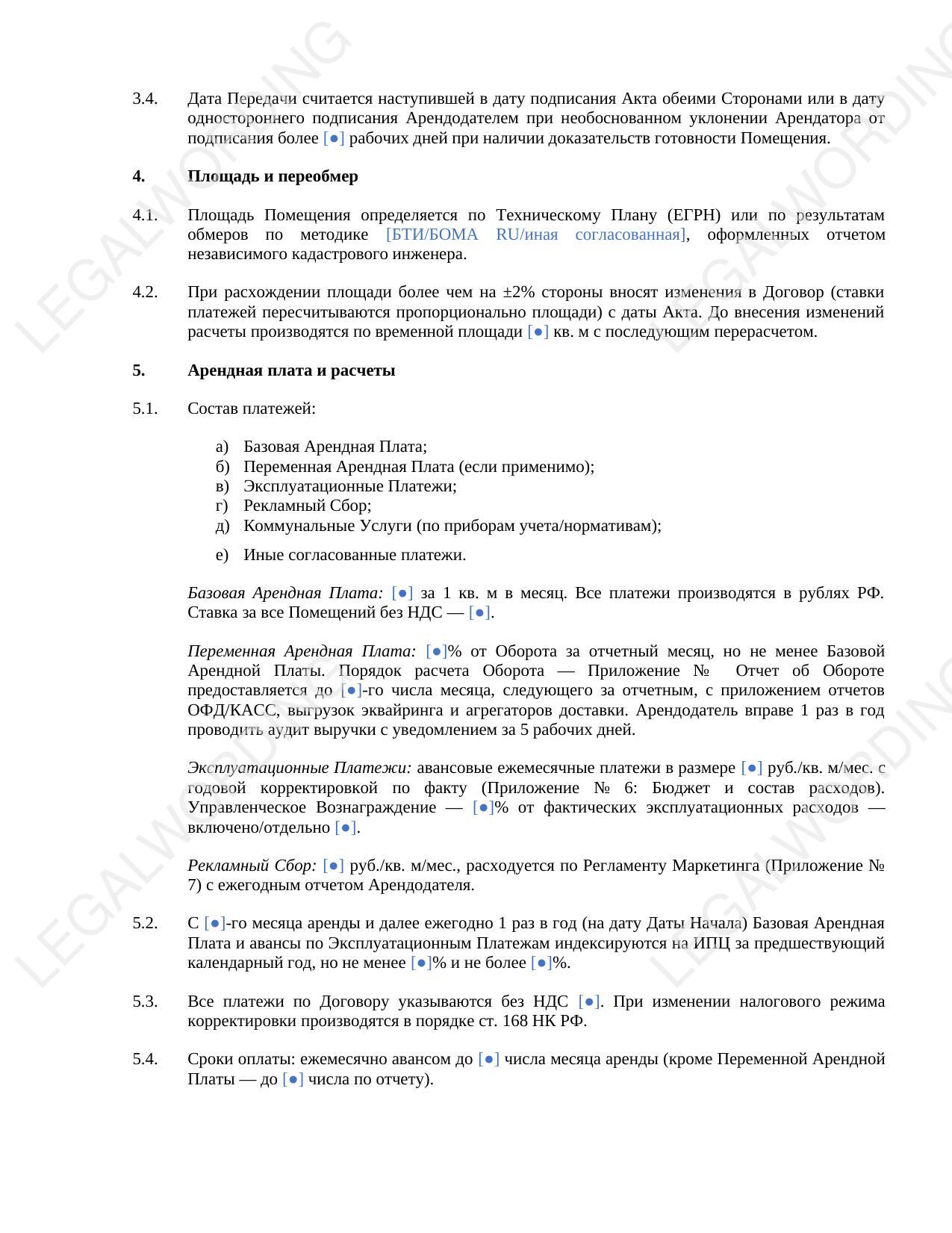 Отдельная ценность — финансовая архитектура, рассчитанная на коммерческие центры и ресторанные форматы: базовая и переменная арендная плата (процент от оборота) с описанным порядком учета выручки и отчетности, эксплуатационные платежи, рекламный сбор с регламентом расходования, индексация, а также обеспечение исполнения обязательств через независимую банковскую гарантию по ст. 368–379 ГК РФ или обеспечительный платеж. В договор включены механизмы контроля (отчет об обороте, право аудита), понятные правила платежей и последствия просрочек, а также повышенные санкции за несвоевременный возврат помещения.