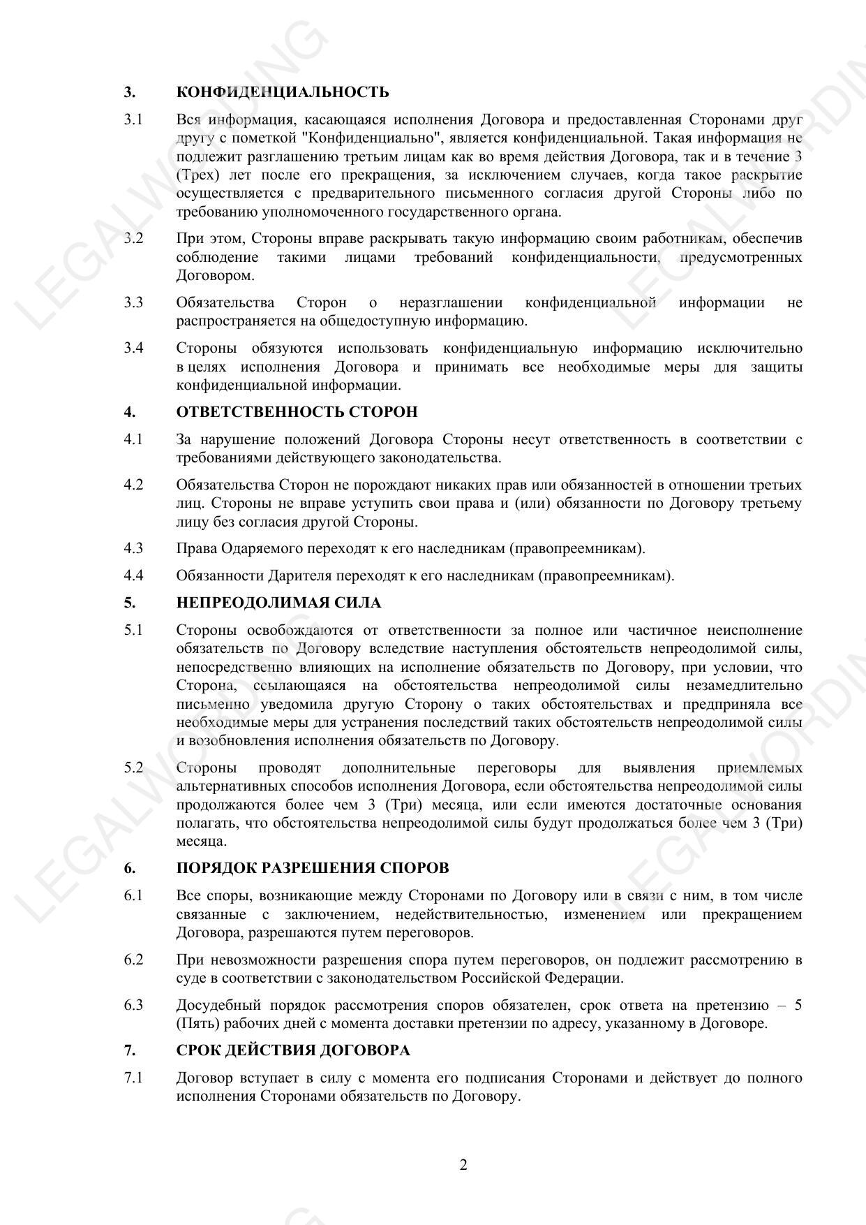 Шаблон договора дарения движимого имущества, заключаемого между физическими или юридическими лицами. Данный шаблон позволяет оформить безвозмездную передачу имущества от Дарителя к Одаряемому. Документ содержит важные разделы, такие как: Предмет договора - обязательства Дарителя по передаче имущества и Одаряемого по его принятию на условиях договора. Порядок передачи имущества - условия и место передачи имущества, оформление акта приема-передачи. Конфиденциальность - условия неразглашения информации, полученной в рамках исполнения договора. Ответственность сторон - меры ответственности за нарушение условий договора и действия сторон при возникновении споров. Непреодолимая сила - обстоятельства, освобождающие стороны от ответственности за неисполнение обязательств. Порядок разрешения споров - процедура досудебного и судебного урегулирования разногласий. Договор регулирует процесс дарения, права и обязанности сторон и включает положения о защите интересов сторон в случае изменения обстоятельств или возникновения споров