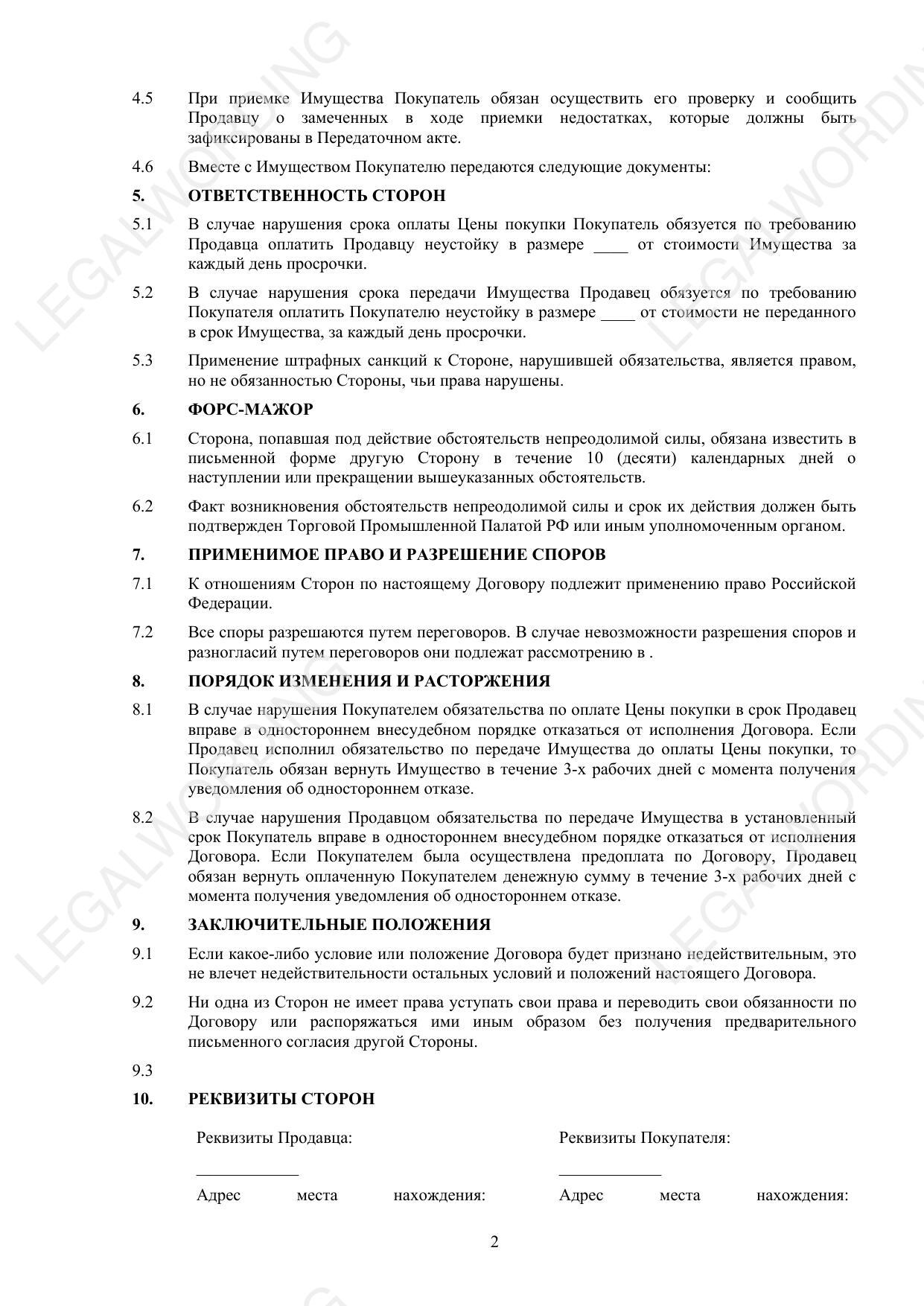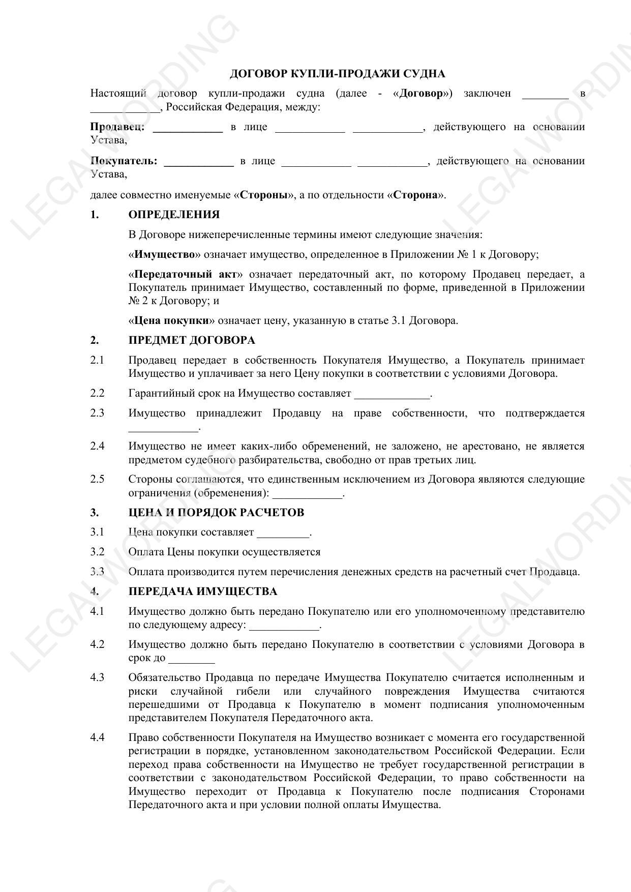 Шаблон договора купли-продажи судна, предназначенного для оформления передачи судна от одного юридического лица другому. Договор включает в себя ключевые положения и основные аспекты сделки. Документ охватывает следующие разделы: 1. Предмет договора - описание передачаемого судна, условия его передачи и гарантийные обязательства. 2. Цена и порядок расчетов - фиксирует стоимость судна и устанавливает порядок оплаты и перевода денежных средств. 3. Передача имущества - определяет порядок, место и сроки передачи судна, а также момент перехода права собственности и риска случайной гибели или повреждения. 4. Ответственность сторон - указывает санкции за нарушение условий договора, включая сроки оплаты и передачи. 5. Форс-мажор - описывает освобождение от ответственности при наступлении обстоятельств непреодолимой силы, а также порядок уведомления другой стороны. 6. Применимое право и разрешение споров - регламентирует право, подлежащее применению к отношениям сторон, и порядок урегулирования споров. 7. Порядок изменения и расторжения - условия, при которых стороны могут в одностороннем порядке отказаться от исполнения договора, и порядок возврата имущества или денежных средств. В договоре также предусмотрены детализированные реквизиты сторон и порядок оформления документов, необходимых для передачи судна