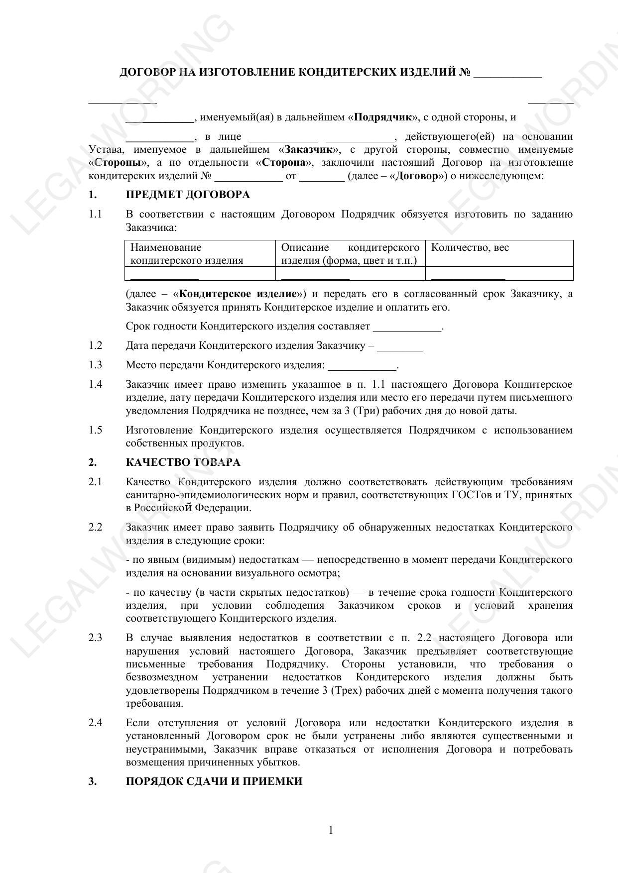 Договор на изготовление кондитерских изделий - превью страницы 1