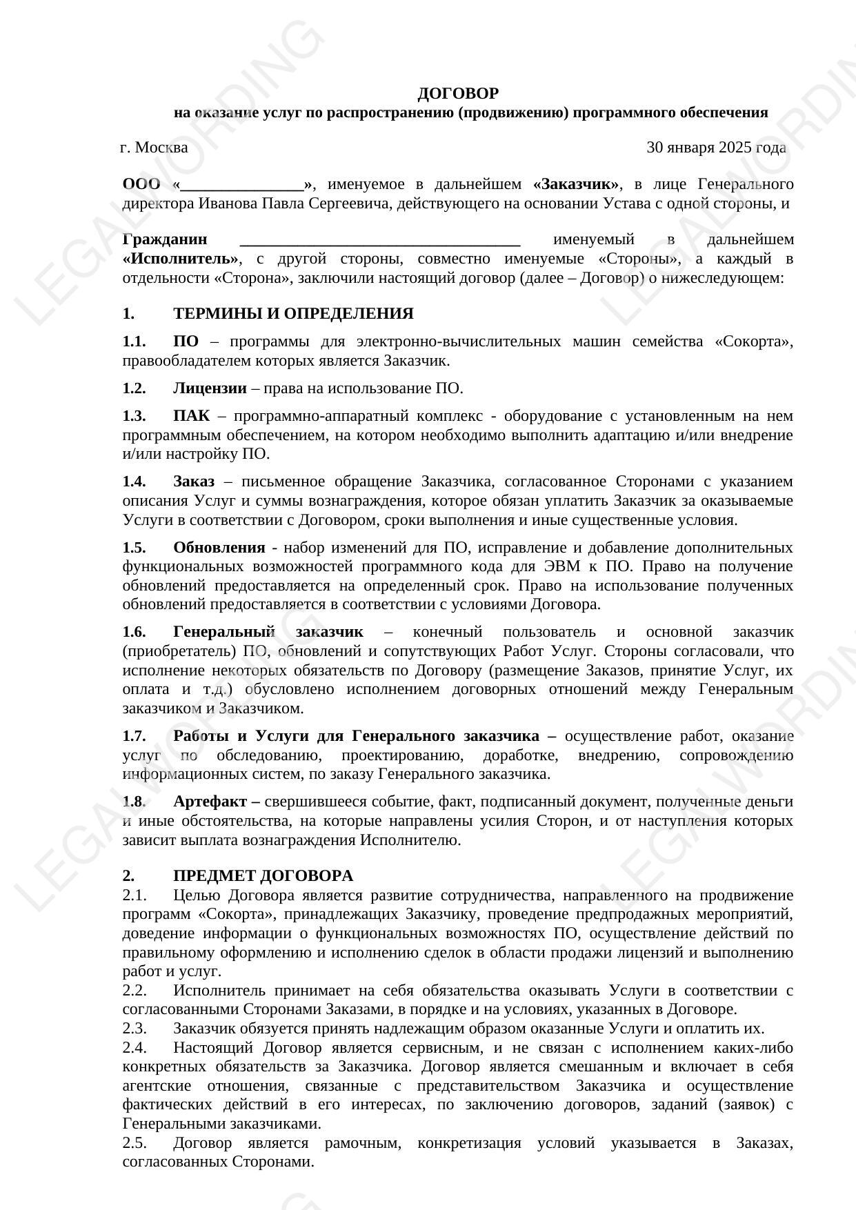 Договор на привлечение физического лица к распространению программного обеспечения. Договор имеет характер агенсткого договора и договора услуг. Смысл договора, исполнитель ищет клиентов, обеспечивает заключение договора, и получает вознаграждение по факту достигнутого результата. Получает процент с продажи или фиксированную сумму. Договор имеет форму заказа. К договору приложена форма отчета.
