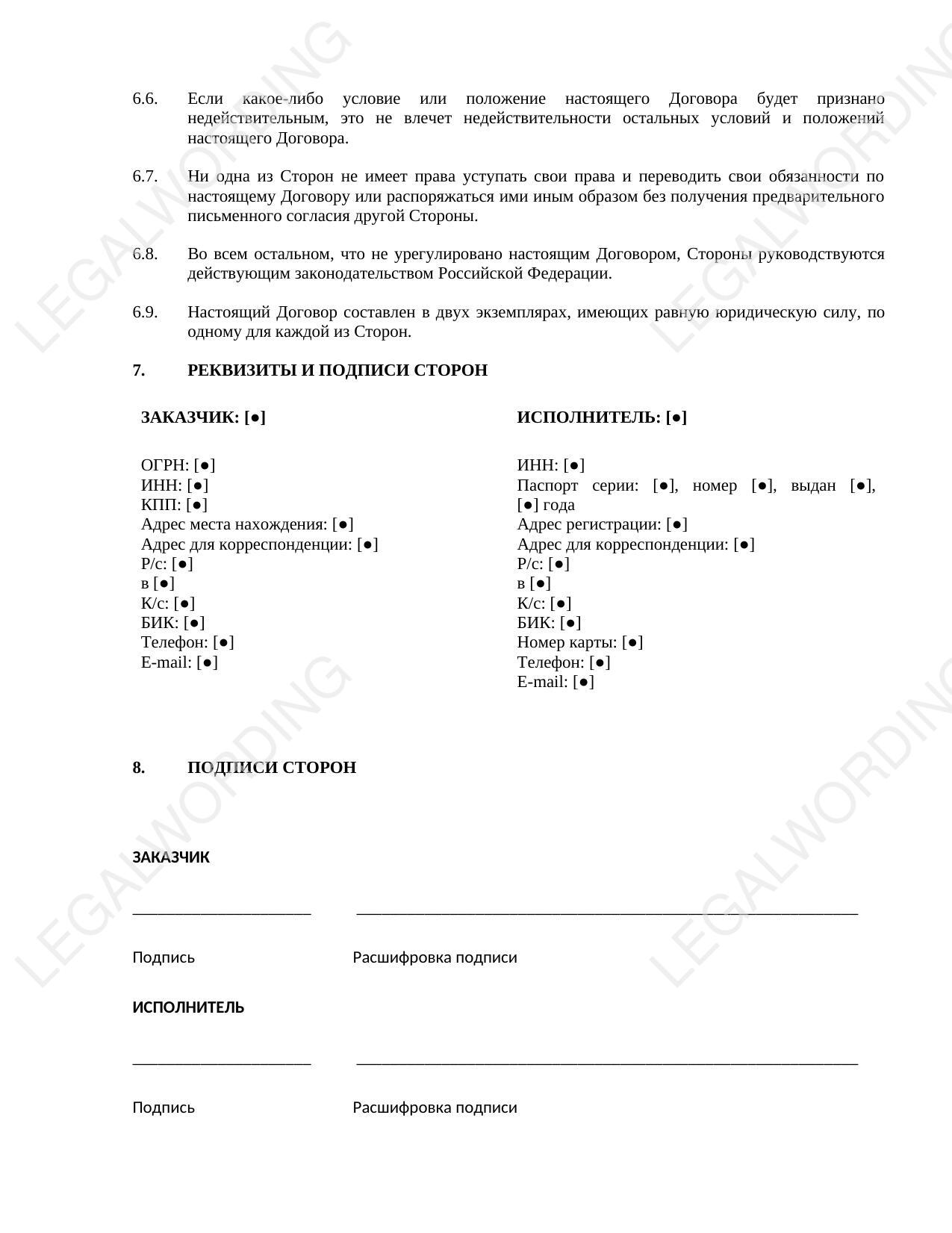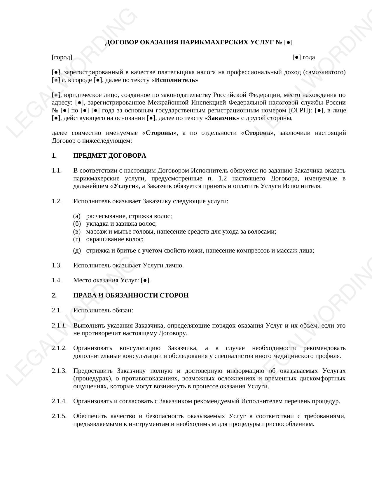 Шаблон договора об оказании парикмахерских услуг между самозанятым и юридическим лицом. В документе подробно прописаны условия предоставления услуг, права и обязанности сторон, стоимость и порядок оплаты, ответственность, конфиденциальность и другие положения.