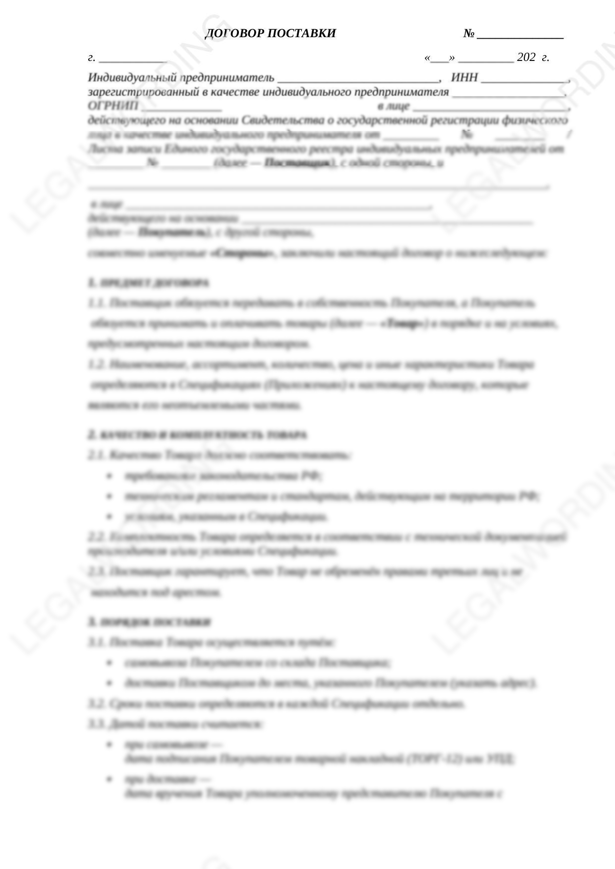 Договор поставки с индивидуальным предпринимателем необходим для юридически верной фиксации достигнутых договоренностей о поставке, предусматривает все необходимые условия для качественной и своевременной поставки, необходим для обращения в суд за защитой нарушенных прав сторон поставки. Удачи!