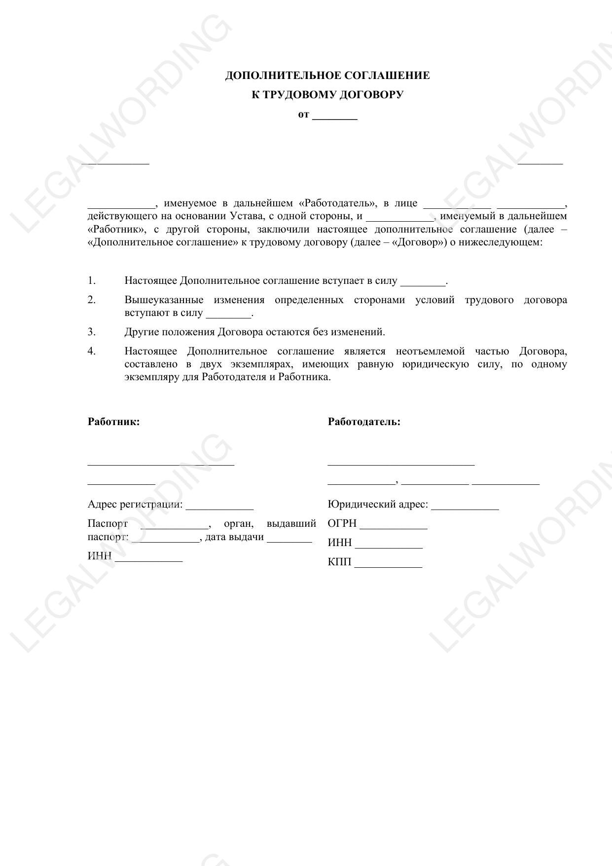 Шаблон дополнительного соглашения к трудовому договору, заключаемого между Работодателем и Работником. Данный шаблон предназначен для официального оформления изменений условий трудового договора. Документ включает ключевые разделы: