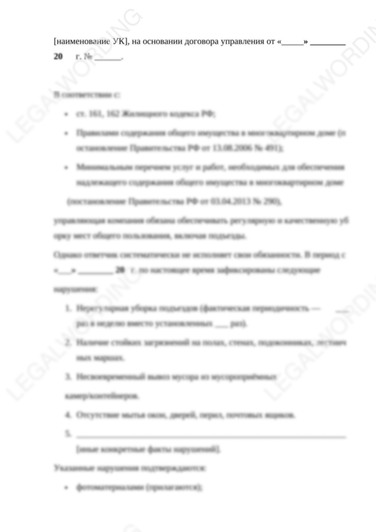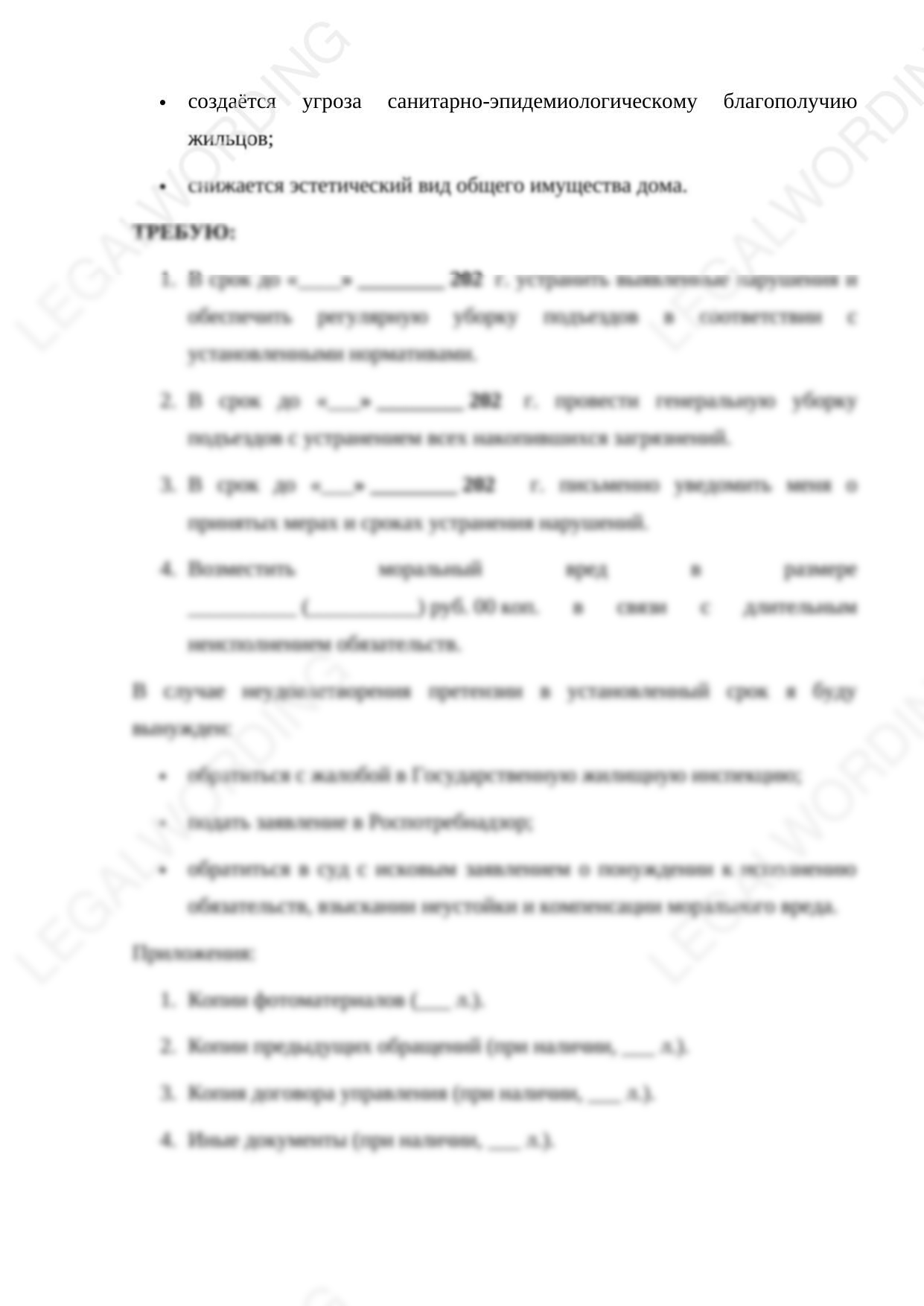 Досудебная претензия к управляющей компании с приложенным к ней иском поможет жильцам заставить управляющую компанию качественно производить уборку подъездов или жильцы смогу обратиться в суд, используя приложение к претензии - Иск в суд к управляющей. Юридически грамотные претензия и иск, помогут вам защитить свое право на благоприятную окружающую среду, возместить ущерб за некачественную уборку. Удачи!