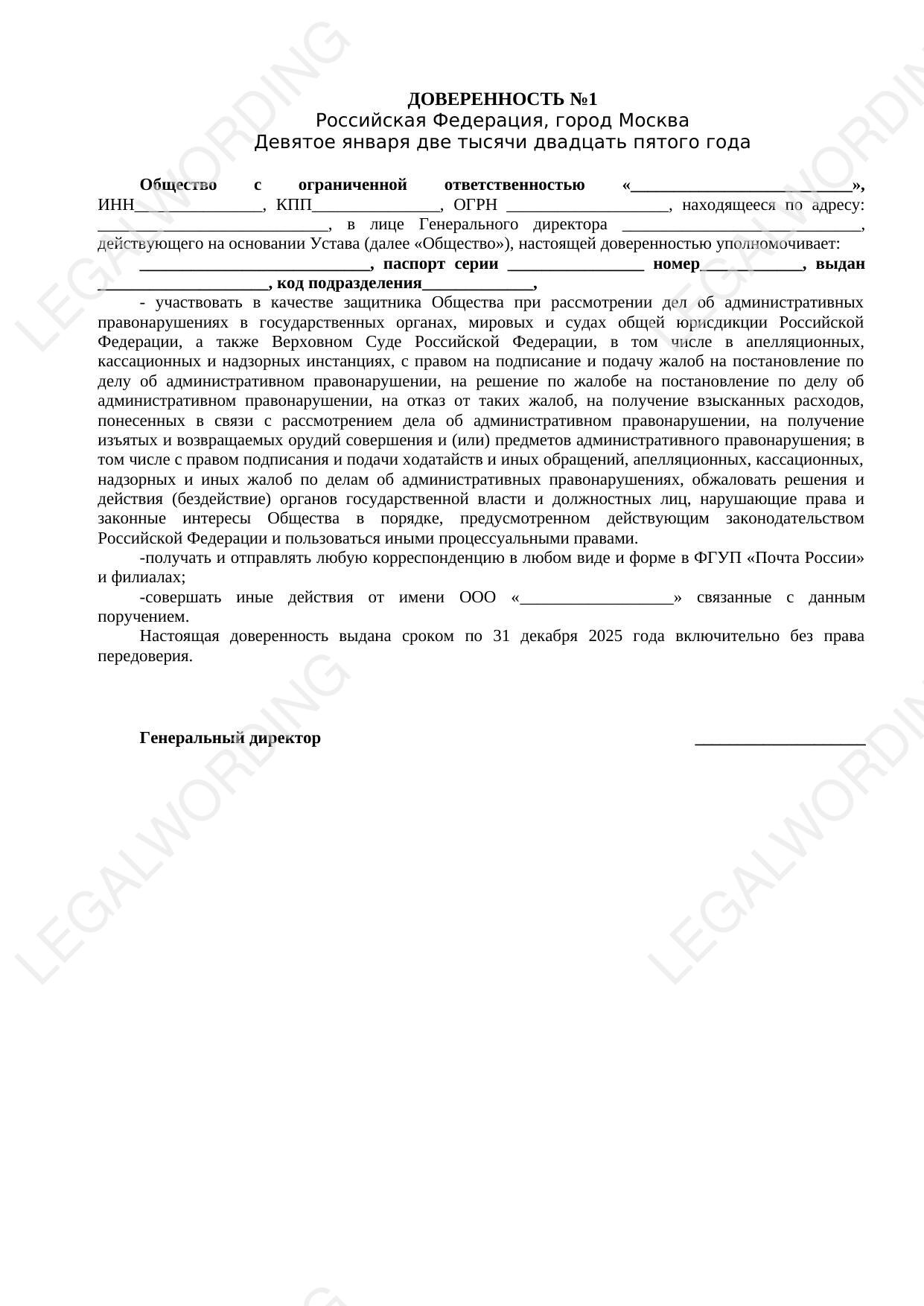 Доверенность от юридического лица для защиты интересов по делам об административных правонарушениях в судах общей юрисдикции, в том числе Верховном суде РФ.