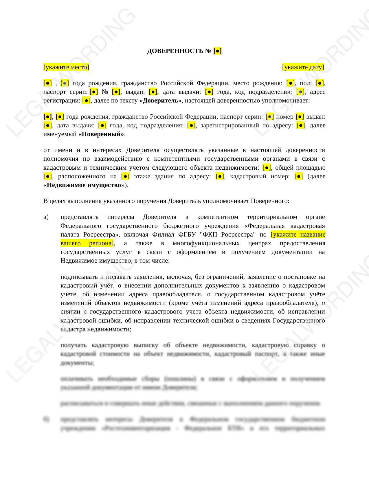 Доверенность для представления интересов доверителя в Росреестре, и многофункциональных центрах предоставления государственных услуг (МФЦ), органах технической инвентаризации в связи с оформлением и получением документации на недвижимое имущество в рамках кадастрового и технического учета объектов недвижимого имущества. Полномочия, среди прочего, включают в себя, подачу заявлений в связи с постановкой на технический и кадастровый учет, исправление кадастровых и технических ошибок, получение кадастровых выписок и справок, технических и кадастровых паспортов, поэтажных планов, экспликаций, а также других документов. Доверитель и поверенный физические лица.