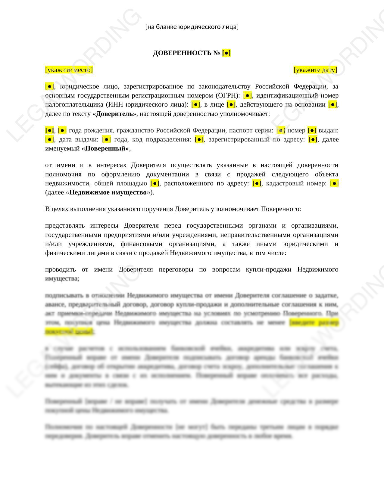 Доверенность с комплексными полномочиями для представления интересов доверителя перед госорганами, организациями, финансовыми организациями и потенциальными покупателями в связи с продажей Недвижимого имущества. Полномочия включают в себя проведение переговоров с ограничениями по согласованию покупной цены, подписание договора купли-продажи, взаимоотношения с банками для организации способа расчетов. Доверитель: юридическое лицо Поверенный: физическое лицо
