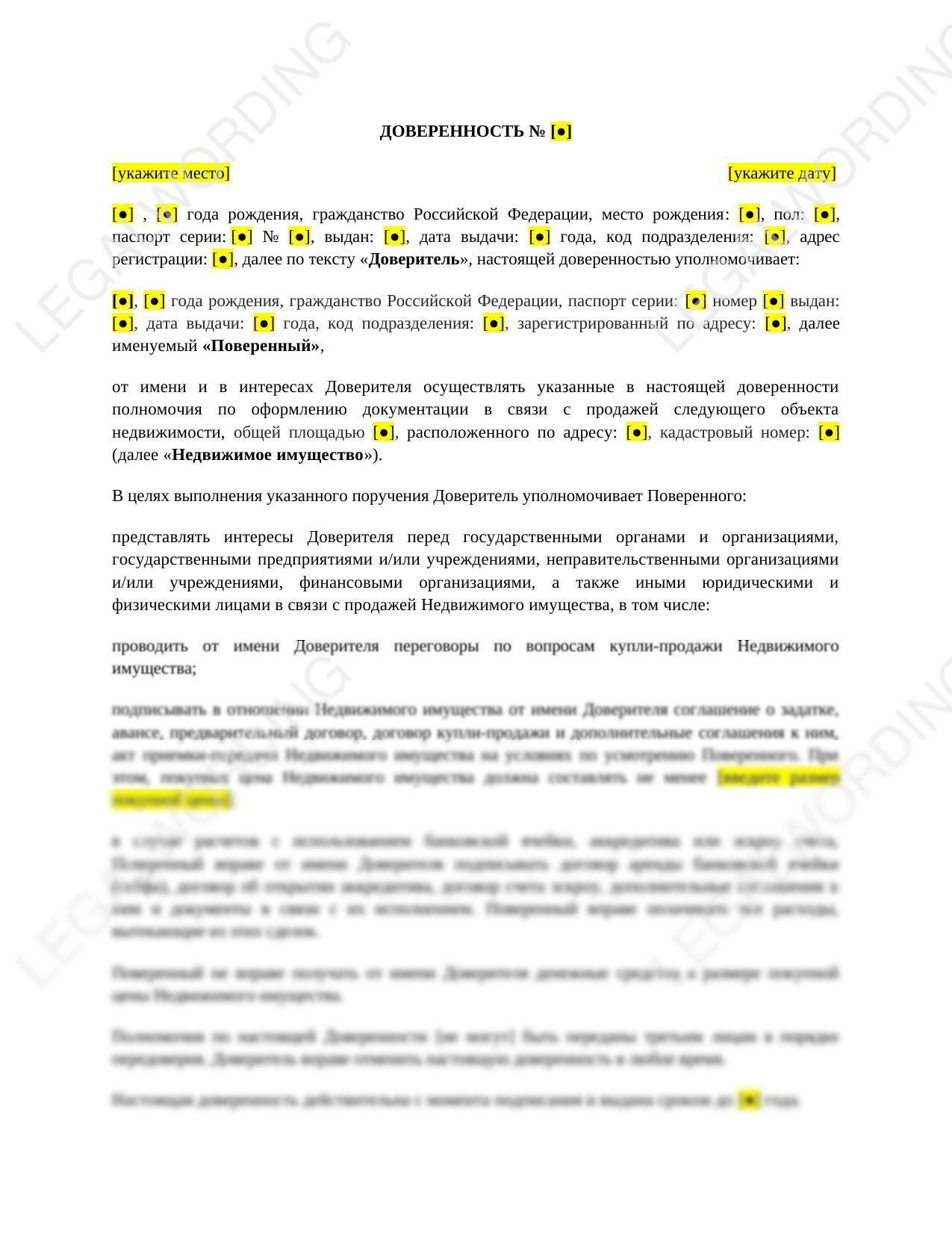 Доверенность с комплексными полномочиями для представления интересов доверителя перед госорганами, организациями, финансовыми организациями и потенциальными покупателями в связи с продажей Недвижимого имущества.
