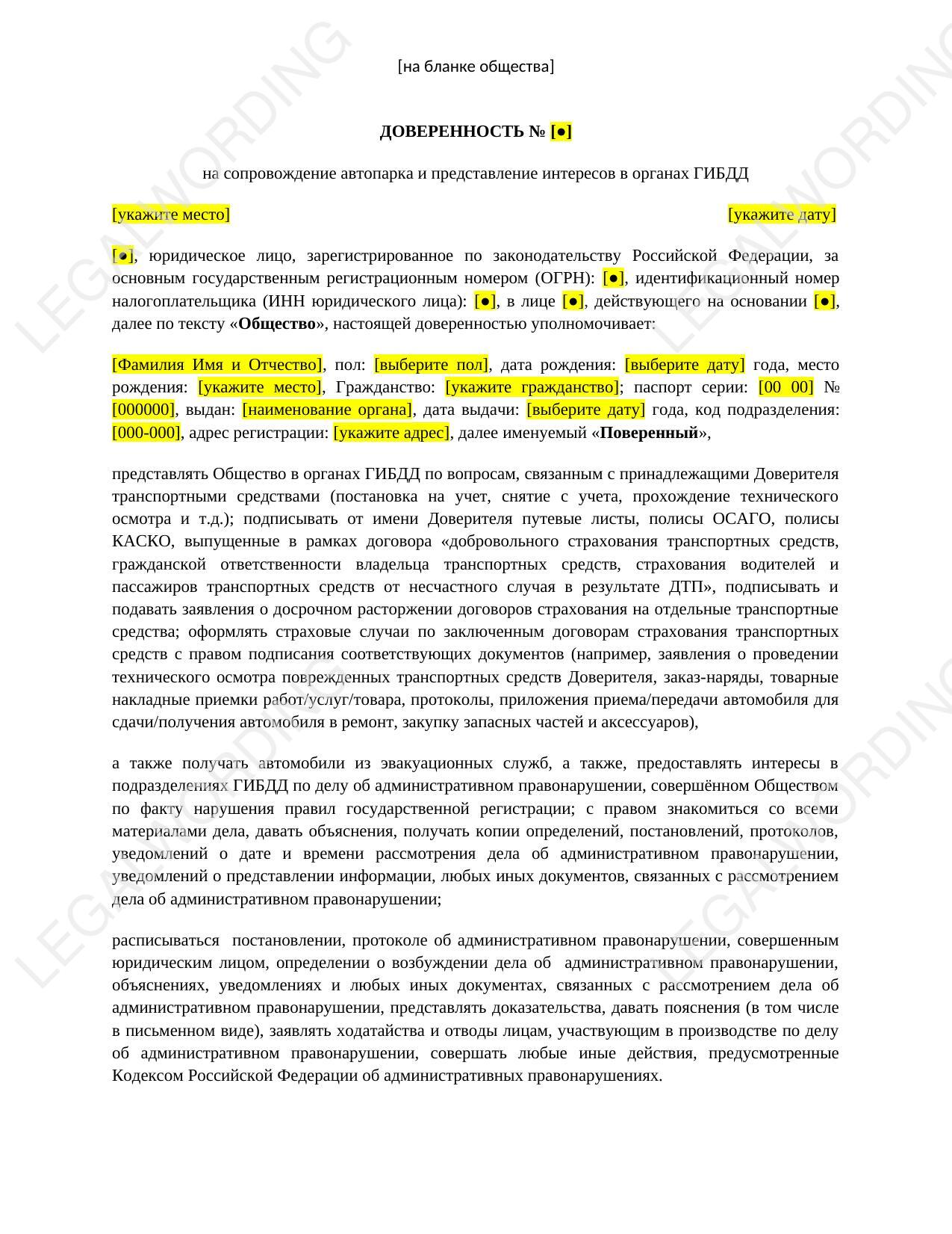 Доверенность подойдет для передачи полномочий сотрудникам транспортного отдела в компании для осуществления действий с ее автопарком.