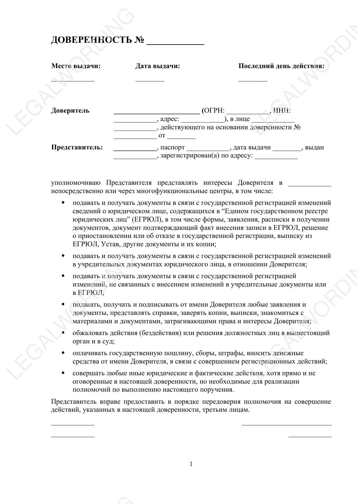 Шаблон доверенности для представления интересов юридического лица. Данная доверенность предназначена для оформления полномочий представителя юридического лица. В документе указаны: