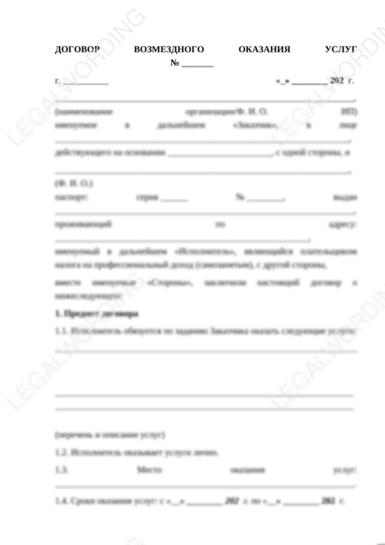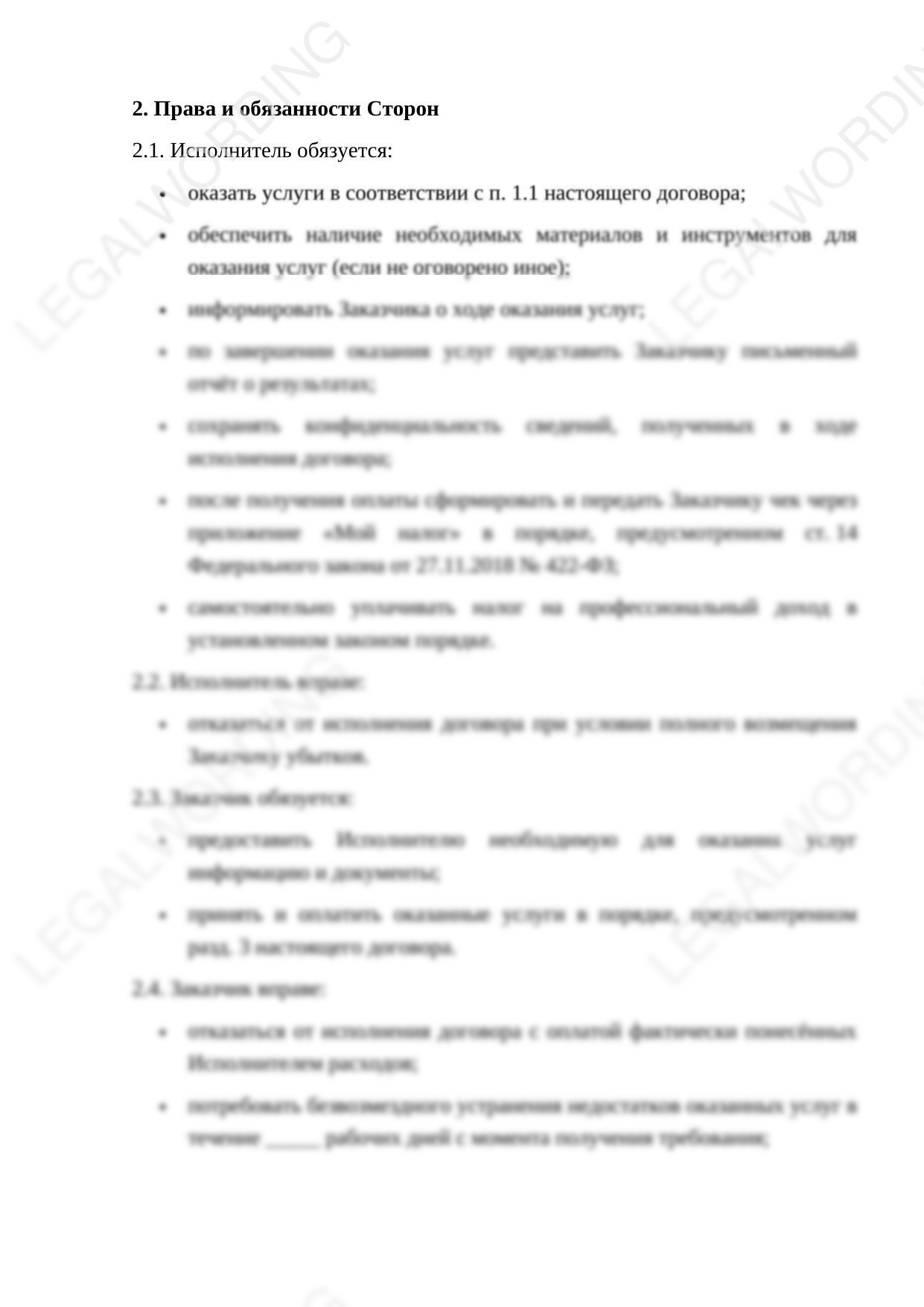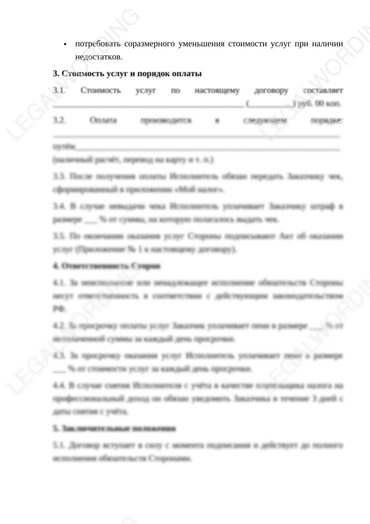 Договор поможет юридически грамотно оформить найм самозанятого на одну или несколько услуг. Договор готов к подписанию, необходимо вписать в него ручкой или впечатать ваши данные.