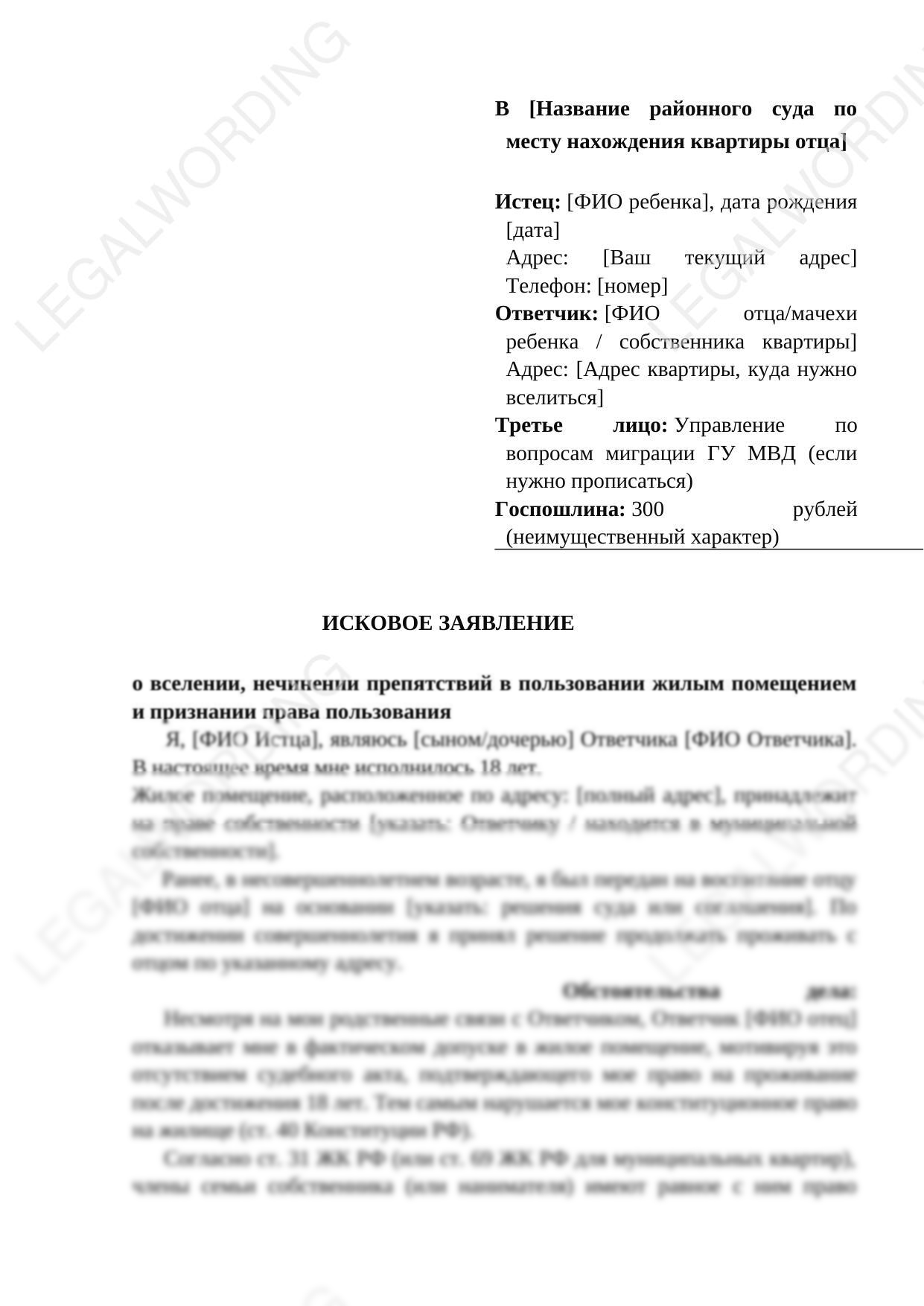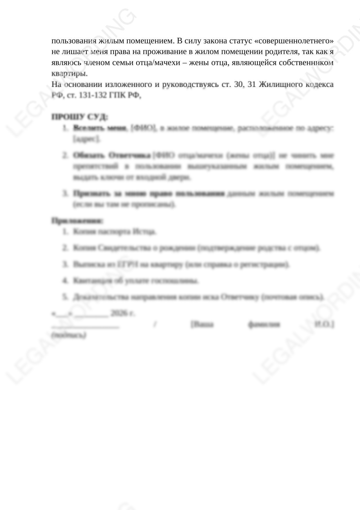 Иск для защитыжилищных прав ребенка, переданного на воспитание отцу и мачехе, где собственником квартиры являются как отец, так и мачеха, отказывающие ребенку, достигшему совершеннолетия в праве проживния. Отец, как правило, похитивший ребенка у матери, совместно с мачехой ребенка после достижения ребенком совершеннолетия отказывают в праве проживания и выбрасывают ребенка на улицу. Иск поможет защитить жилищное право ребенка от недобросовестных действий как отца, так и мачехи.