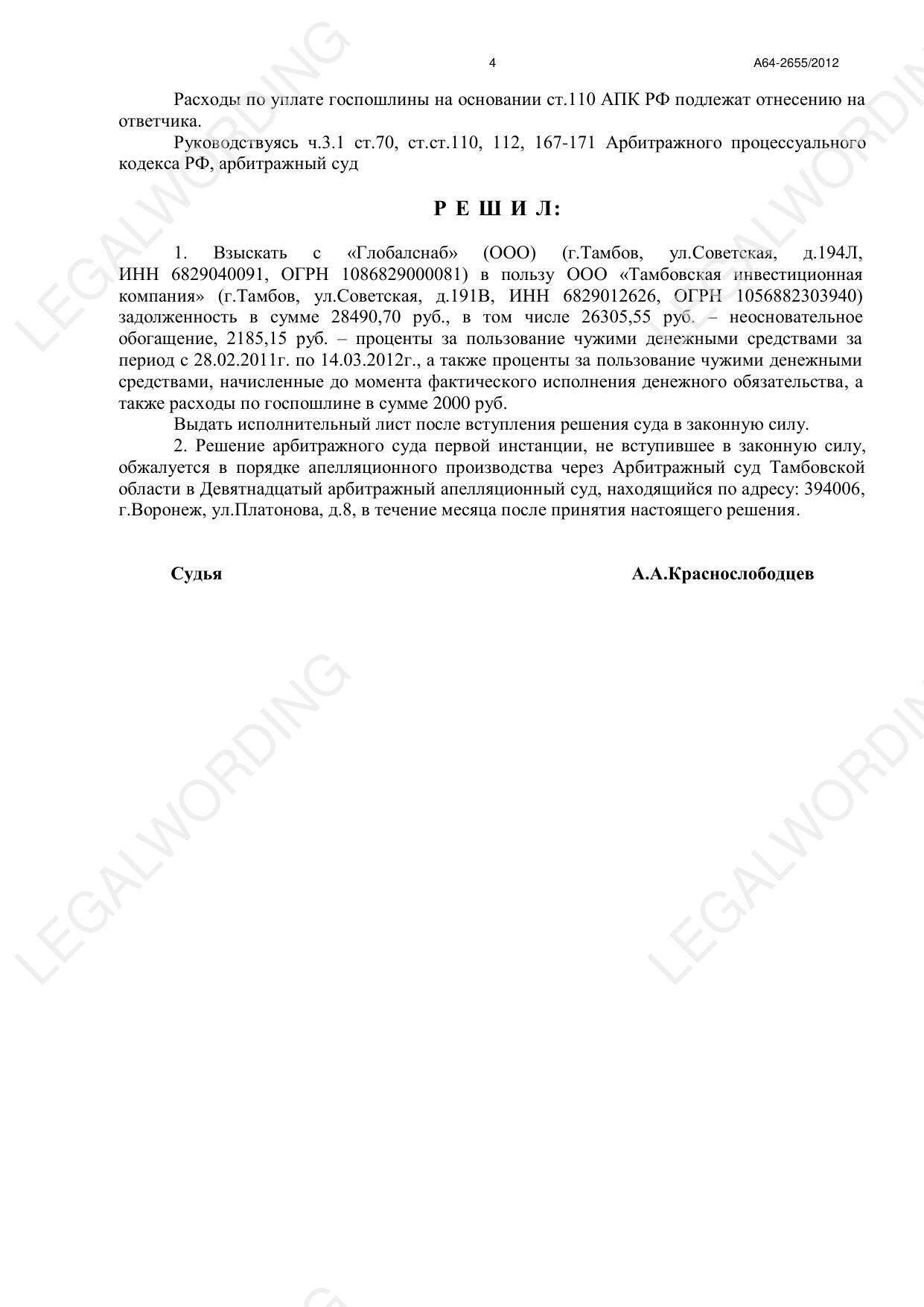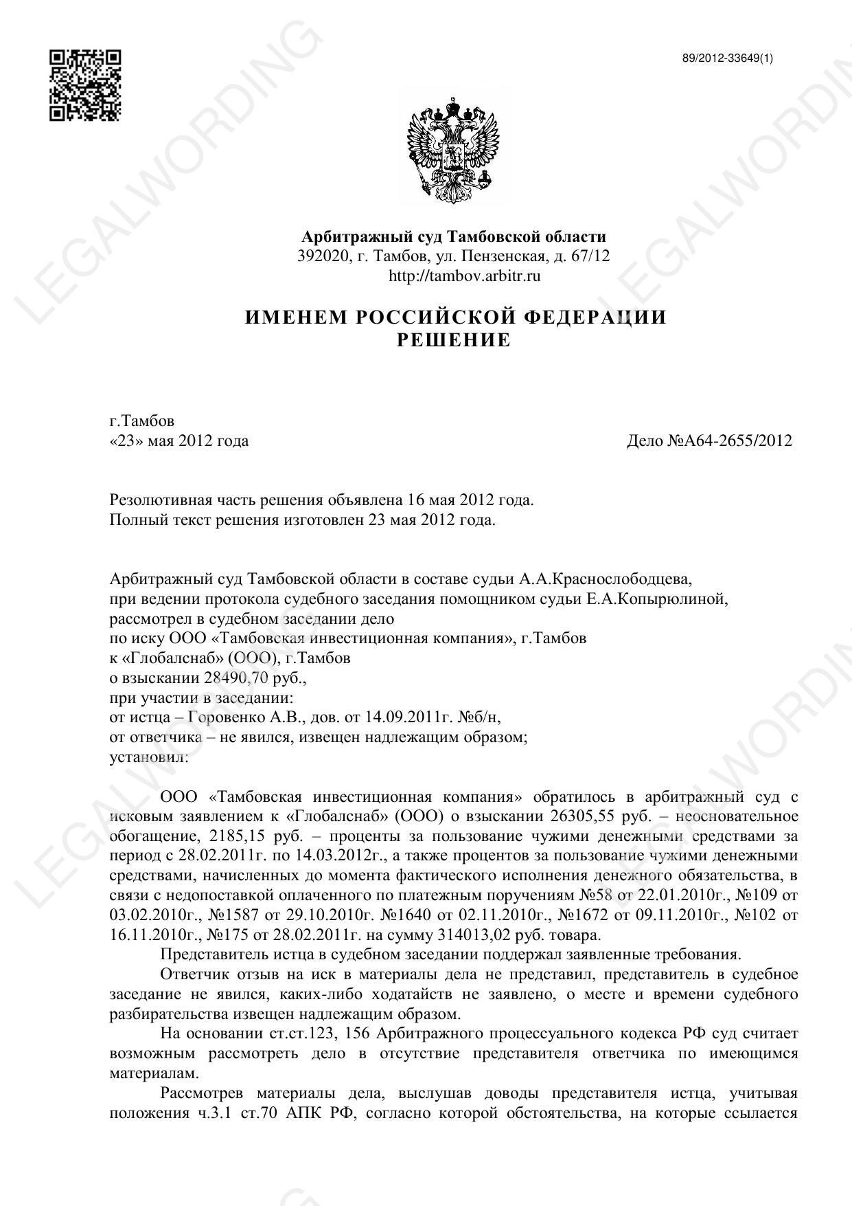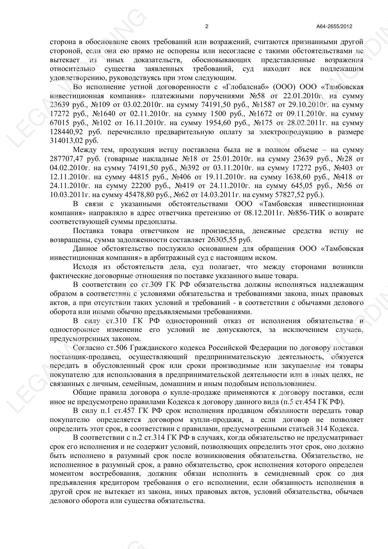 Решение по делу А64-2655/2012