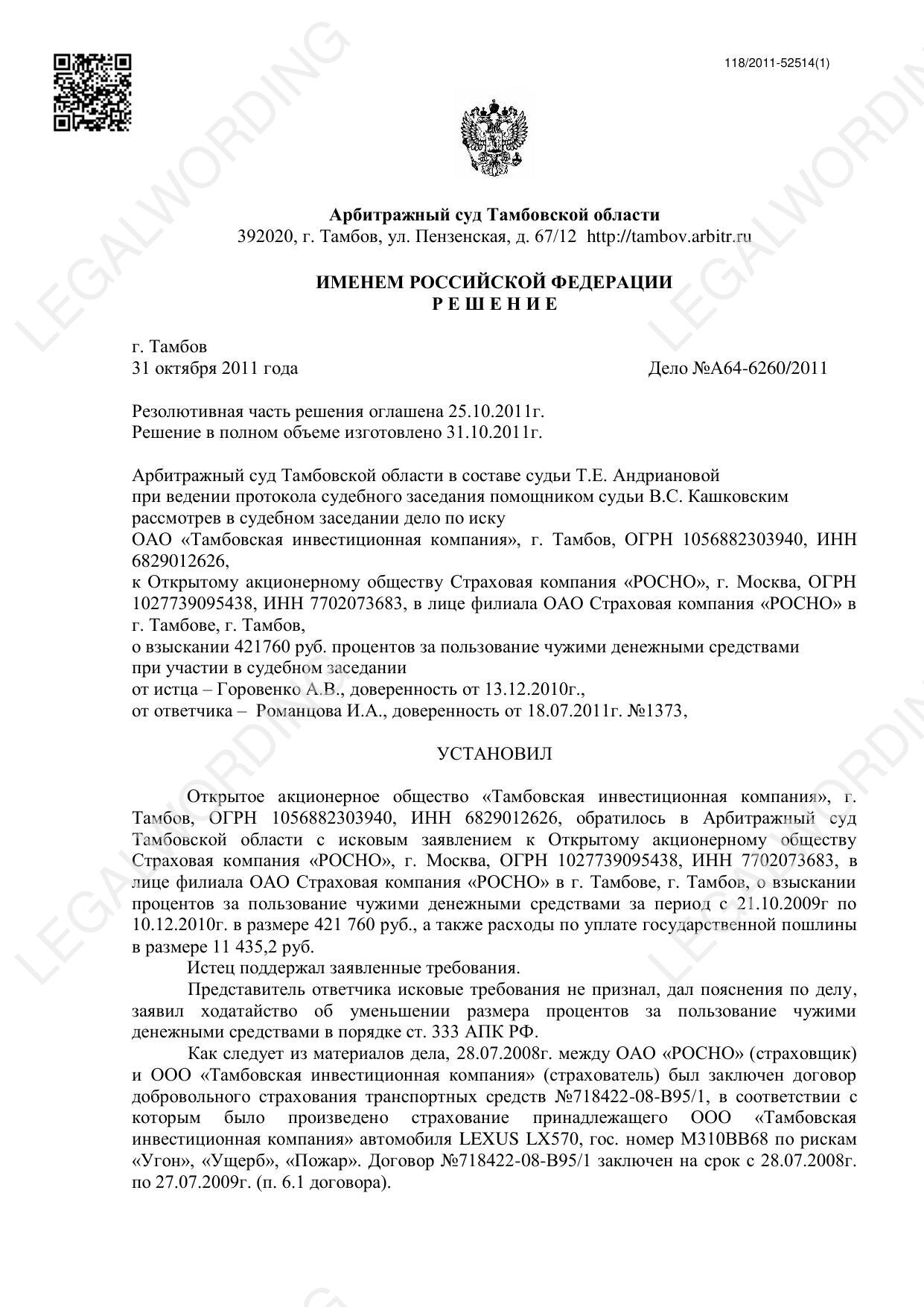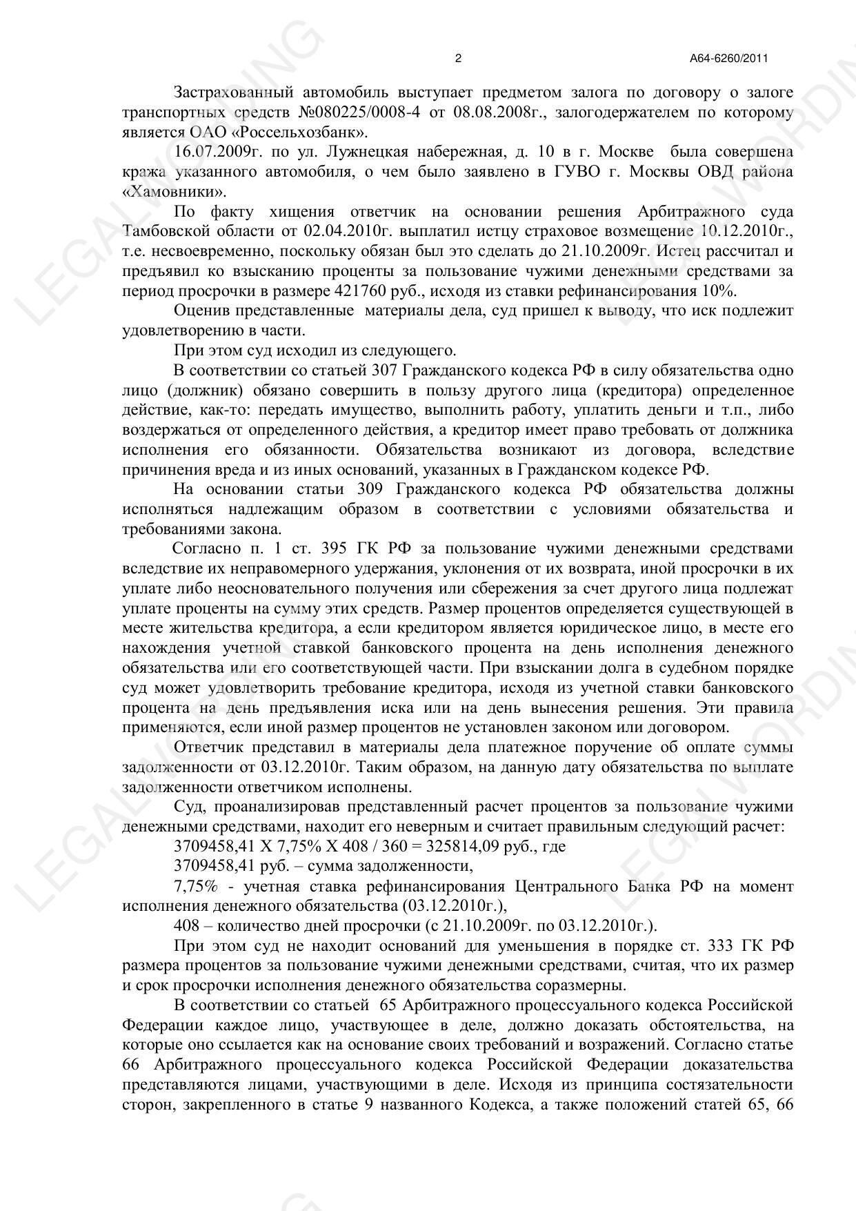 Страховая компания РОСНО нарушила срок выплаты страхового возмещения за угон Лексуса. В судебном порядке была взыскана сумма страхового возмещения 3709458,41 руб. После этого взысканы проценты по ст. 395 ГК РФ.