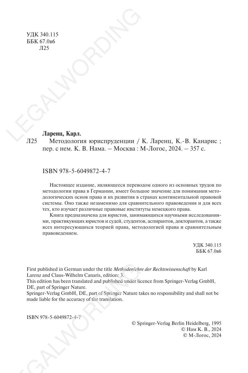Выходные данные: Методология юриспруденции / К. Ларенц, К.-В. Канарис ; пер. с нем. К. В. Нама. – Москва : М-Логос, 2024. – 357 с. ISBN 978-5-6049872-4-7
