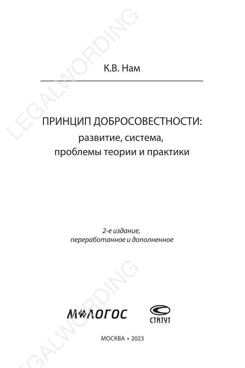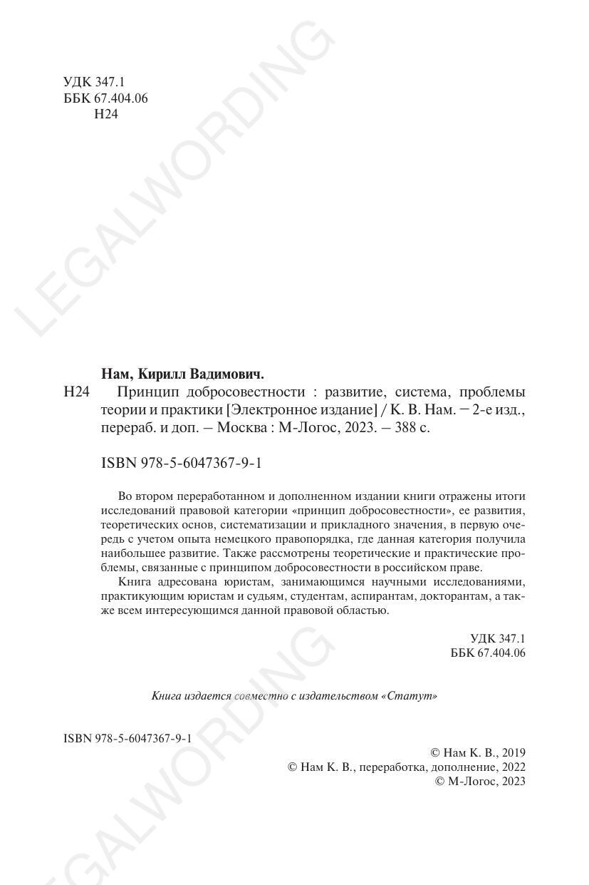 Выходные данные: Принцип добросовестности : развитие, система, проблемы теории и практики [Электронное издание] / К. В. Нам. − 2-е изд., перераб. и доп. – Москва : М-Логос, 2023. – 388 с. ISBN 978-5-6047367-9-1 Книга размещена на сайте Юридического института М-Логос. https://m-lawbooks.ru/