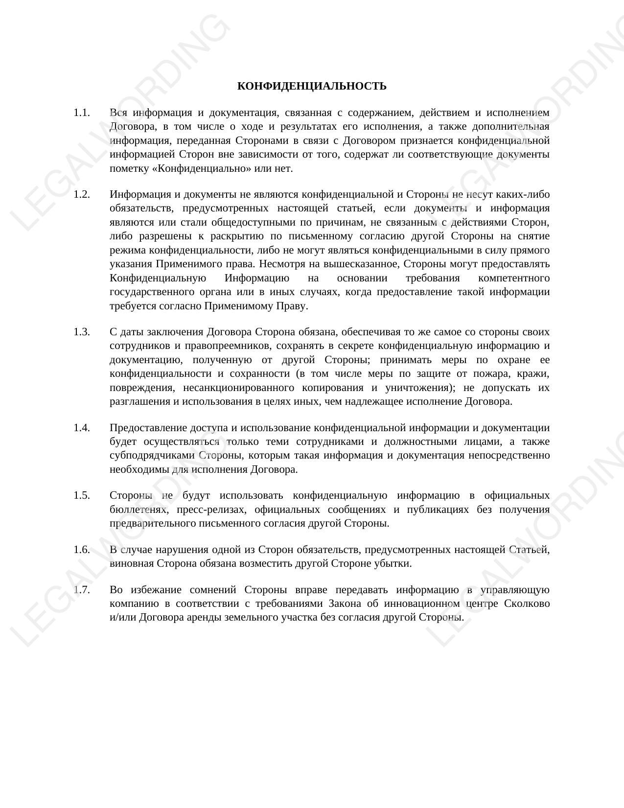 Стандартное положение о соблюдении конфиденциальности в равной степени защищает обе стороны. Подойдет практически для любого договора.