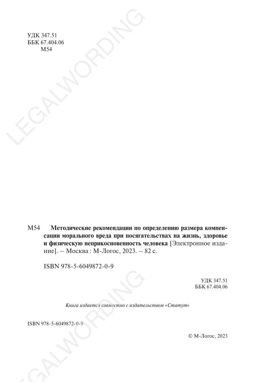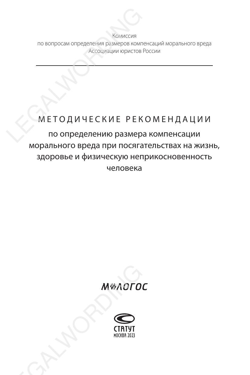 Выходные данные: Методические рекомендации по определению размера компенсации морального вреда при посягательствах на жизнь, здоровье и физическую неприкосновенность человека [Электронное издание]. – Москва : М-Логос, 2023. – 82 с. ISBN 978-5-6049872-0-9 Книга размещена на сайте Юридического института М-Логос. https://m-lawbooks.ru/