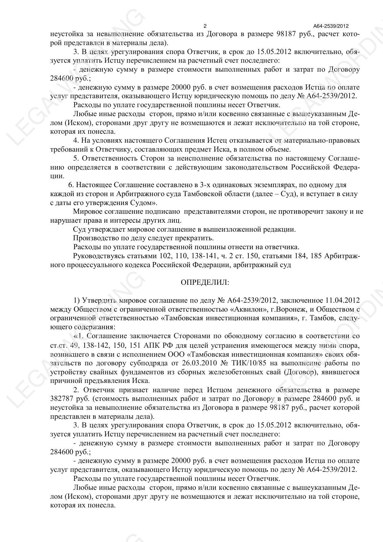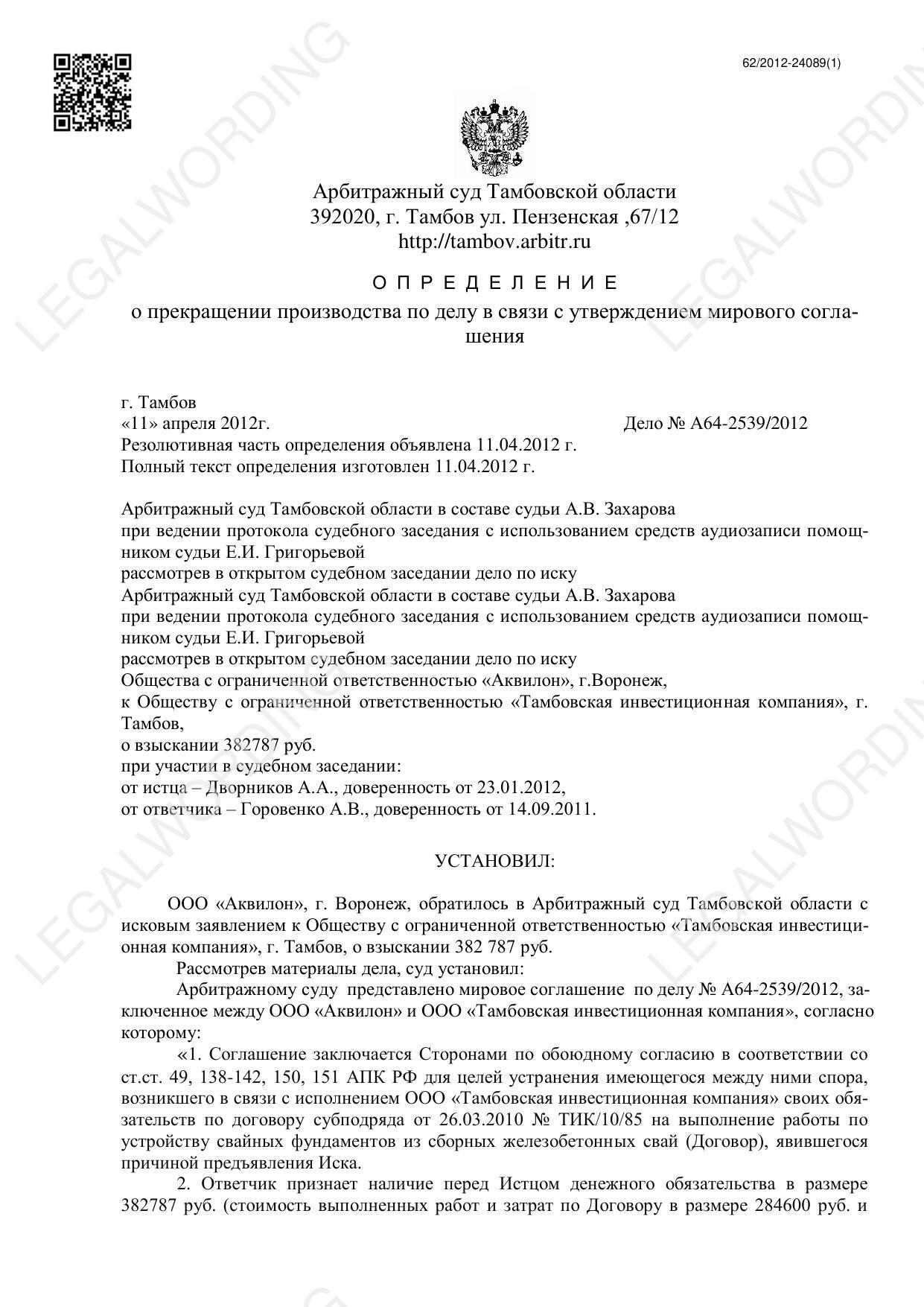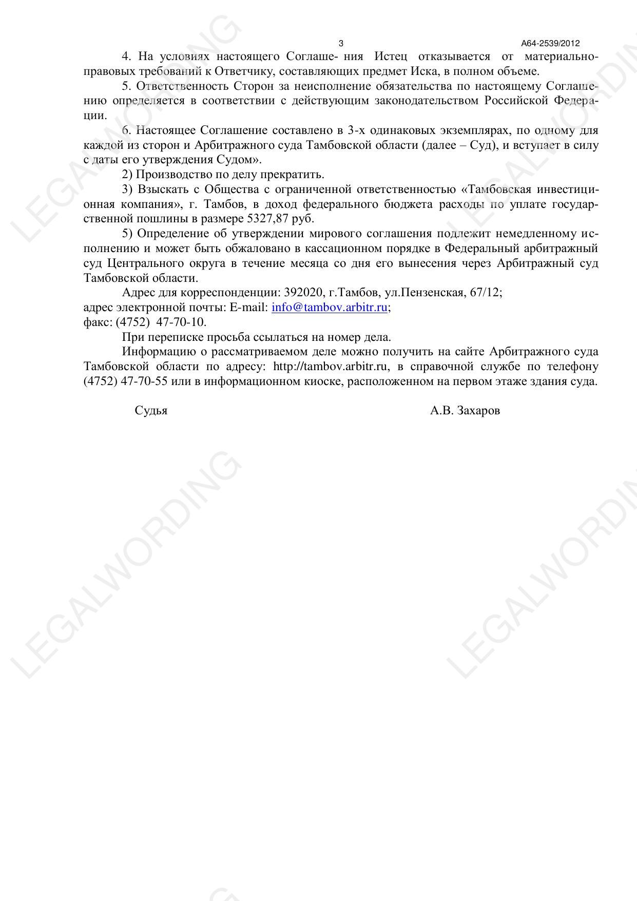 Урегулирование спора путем заключения в Арбитражном суде Тамбовской области мирового соглашения по делу А64-2539/2012.