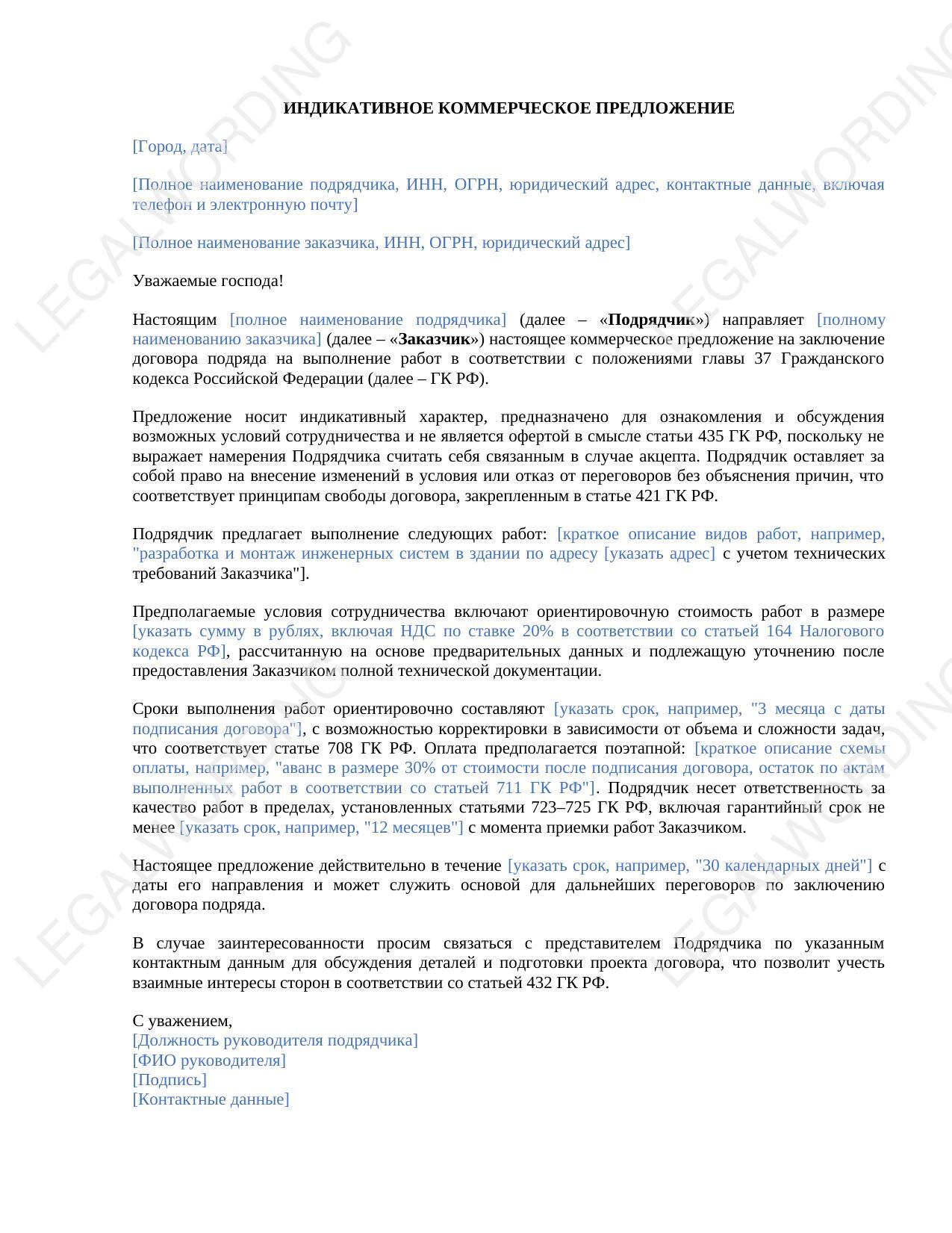 Такой документ используется на предварительном этапе переговоров, когда стороны обсуждают ориентировочные условия, стоимость, сроки и другие параметры будущего договора подряда, но ещё не готовы к юридически обязывающим обязательствам.
