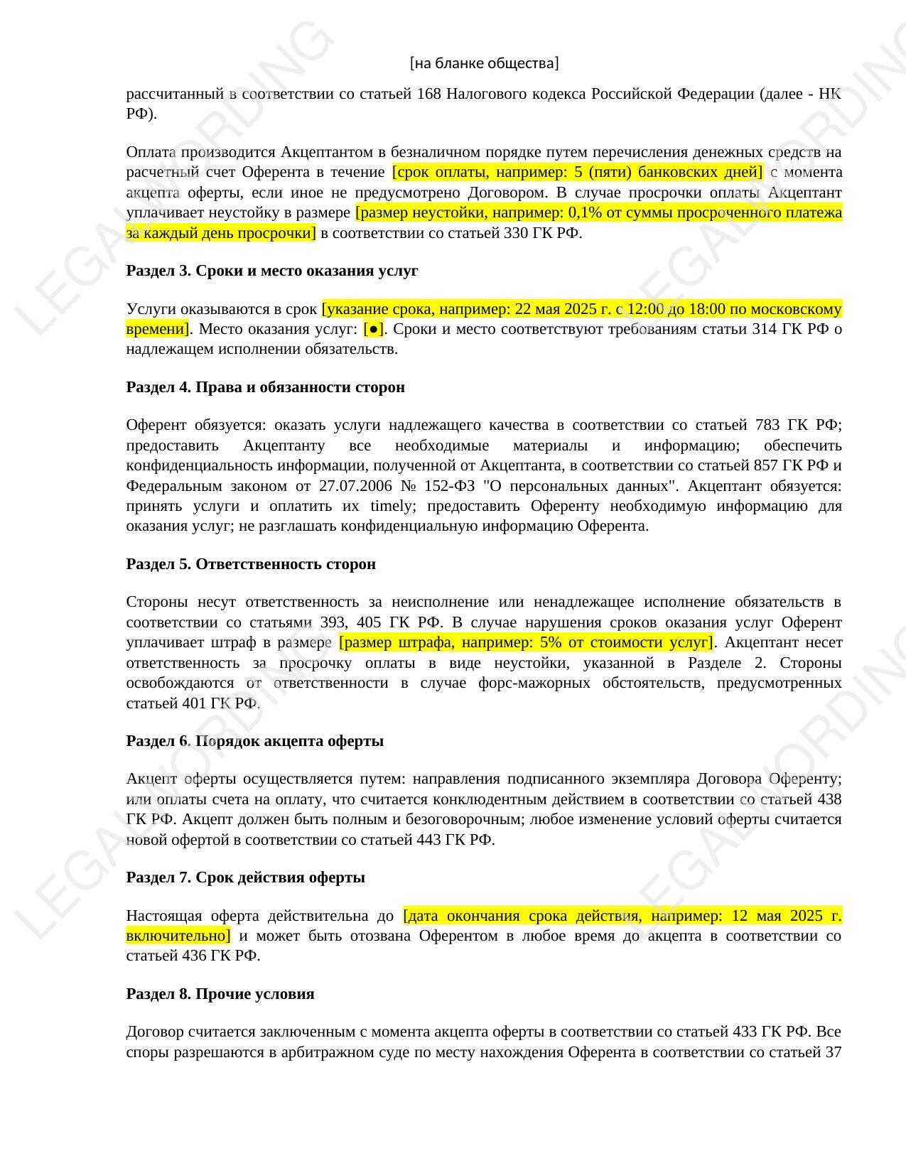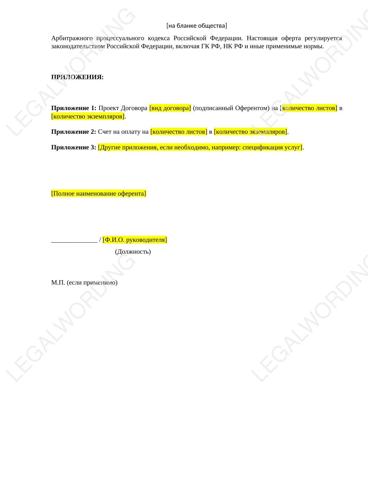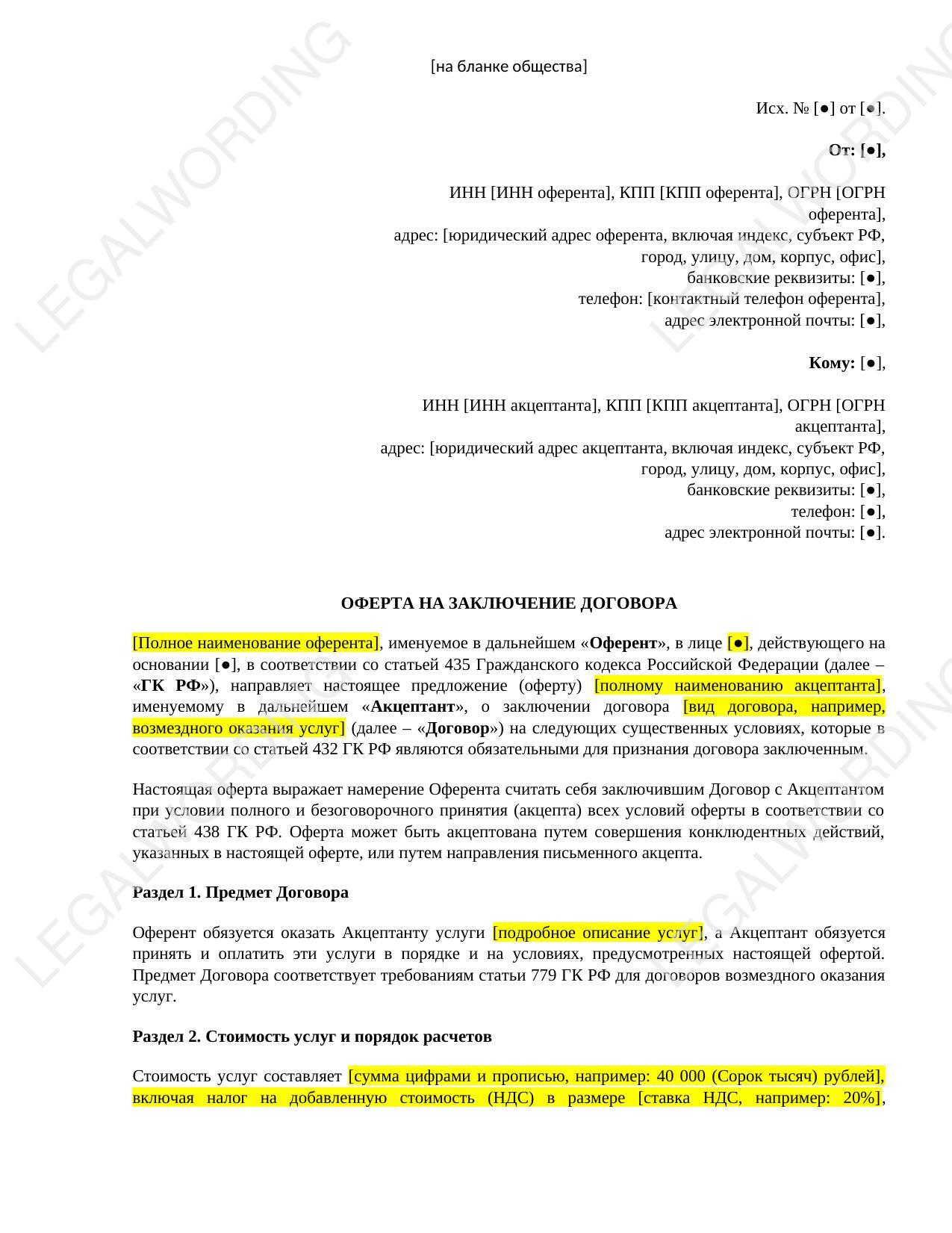 Это шаблон оферты на заключение договора, составленный в соответствии с Гражданским кодексом Российской Федерации (ГК РФ). Он предназначен для направления предложения (оферты) от одной стороны (Оферента) другой (Акцептанту) о заключении договора, например, возмездного оказания услуг.