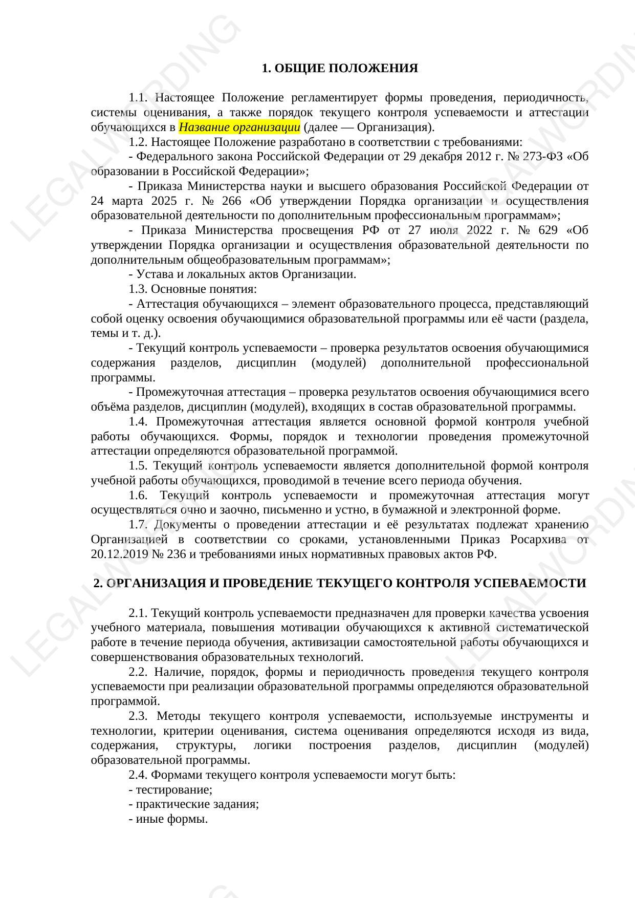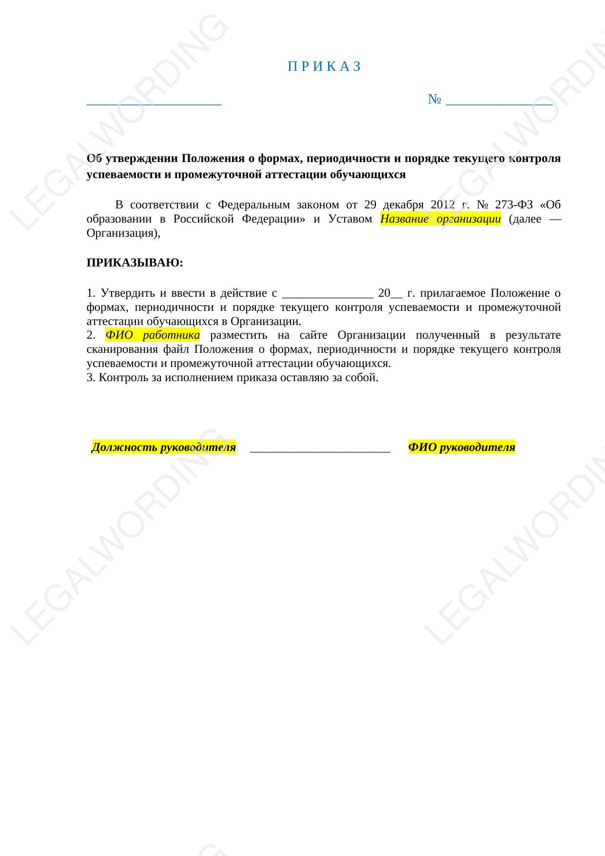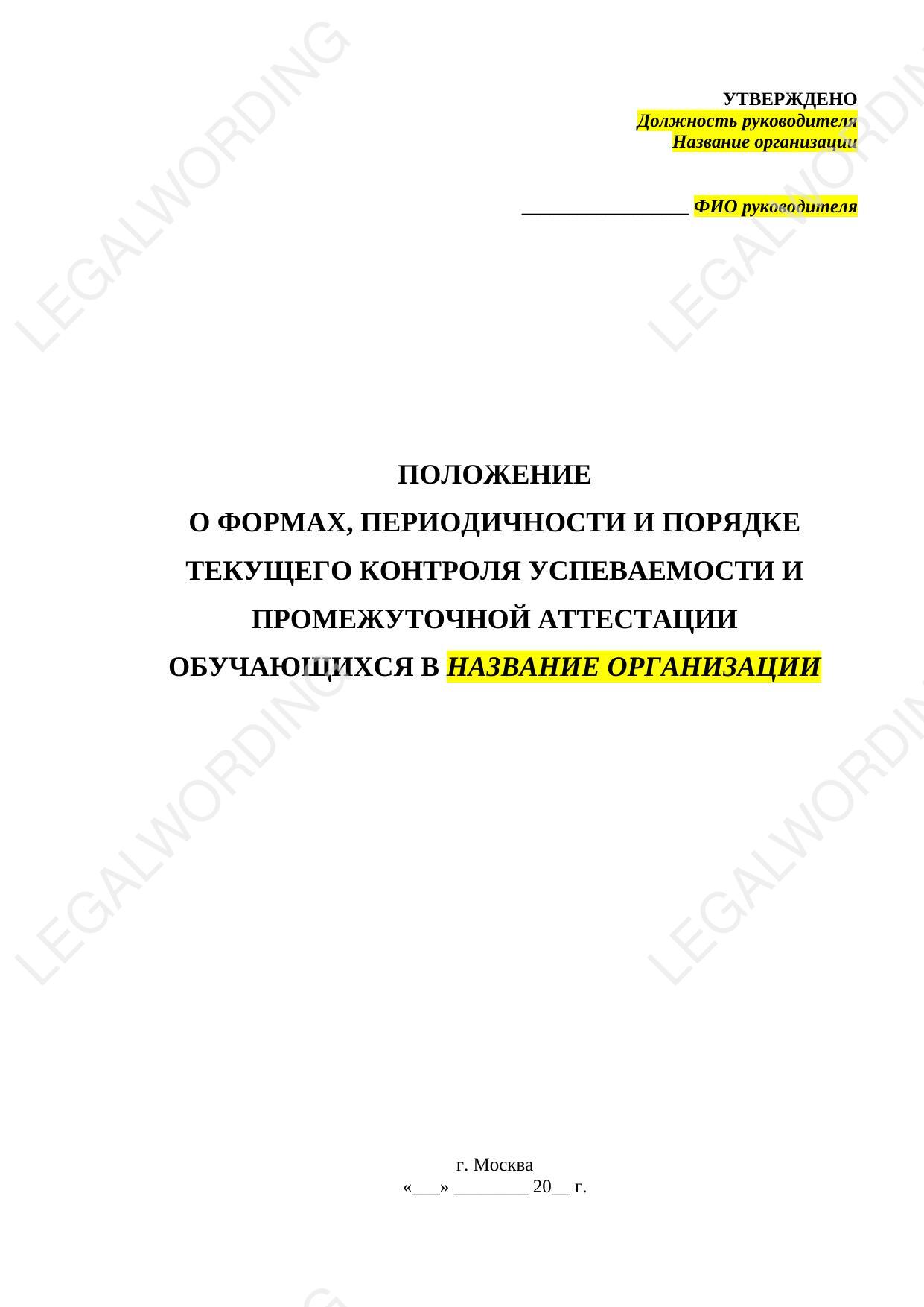 Положение регулирует формы, периодичность и порядок текущего контроля успеваемости и промежуточной аттестации обучающихся в образовательной организации. Снабжено приказом об утверждении.