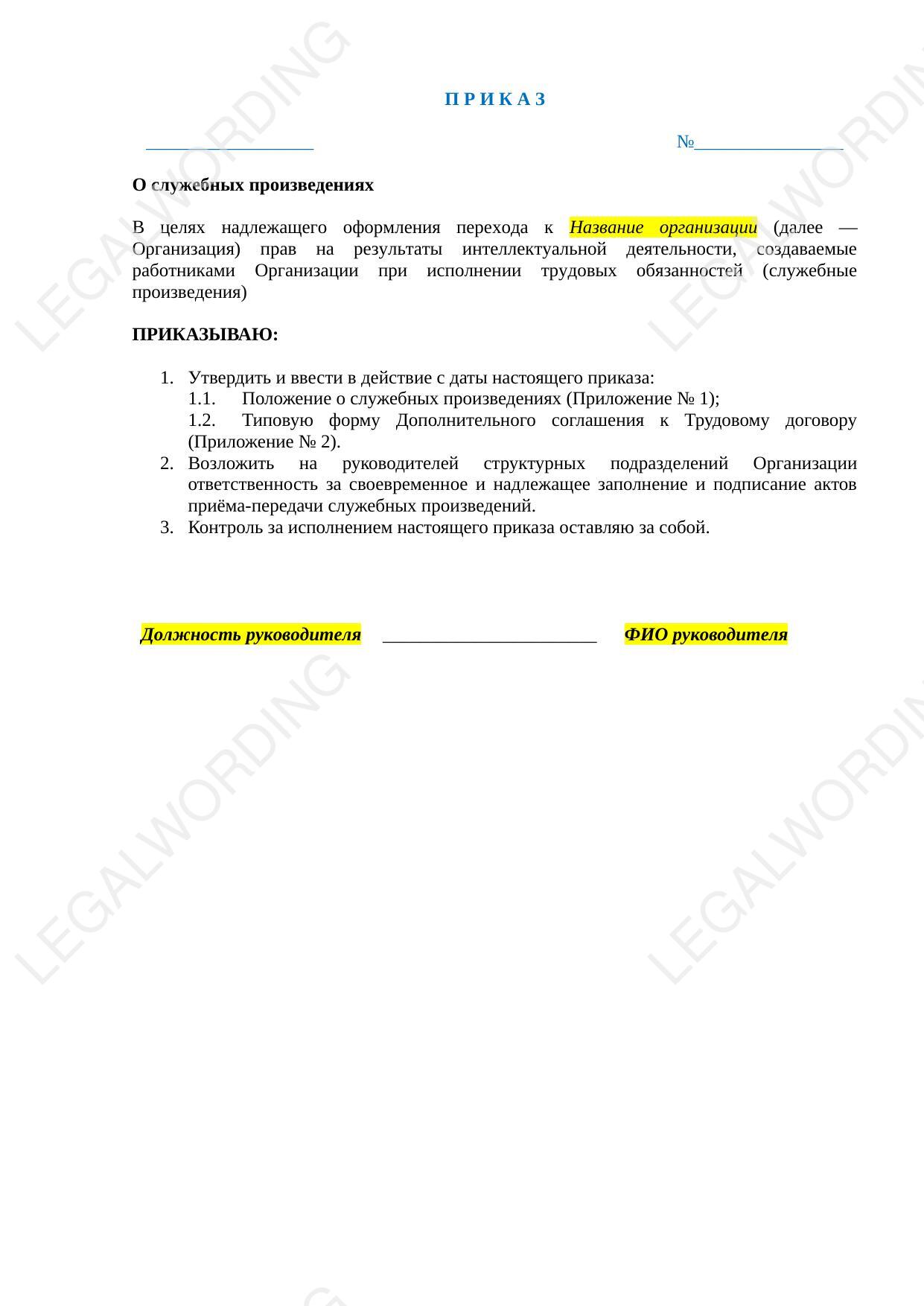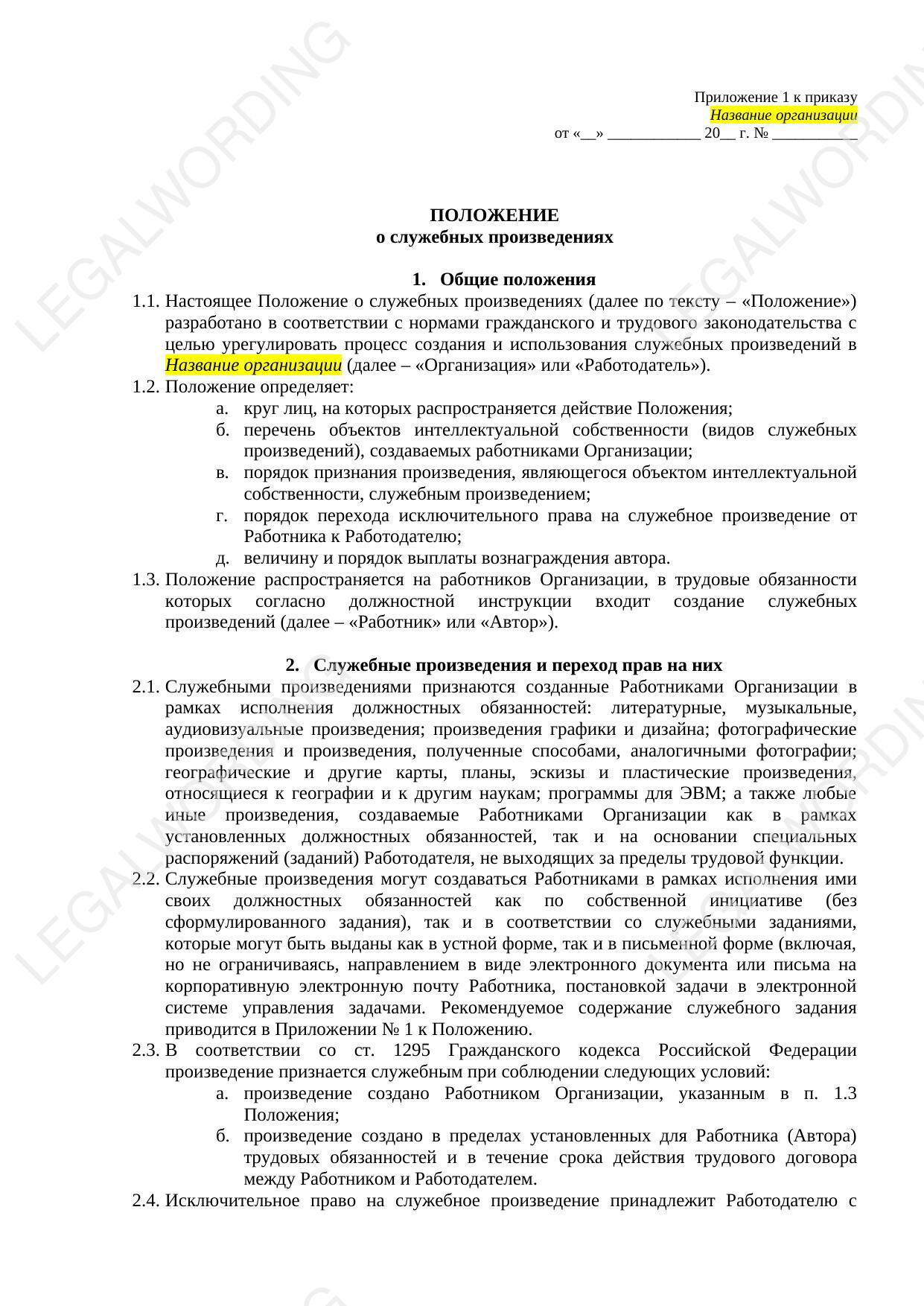 Положение устанавливает перечень объектов интеллектуальной собственности (видов служебных произведений), создаваемых работниками Организации, порядок признания произведения, являющегося объектом интеллектуальной собственности, служебным произведением, порядок перехода исключительного права на служебное произведение от работника к работодателю, порядок выплаты работнику вознаграждения. Положение снабжено приказом о его утверждении, формами служебного задания на создание результата интеллектуальной деятельности, акта приёма-передачи служебного произведения, дополнительного соглашения к трудовому договору.