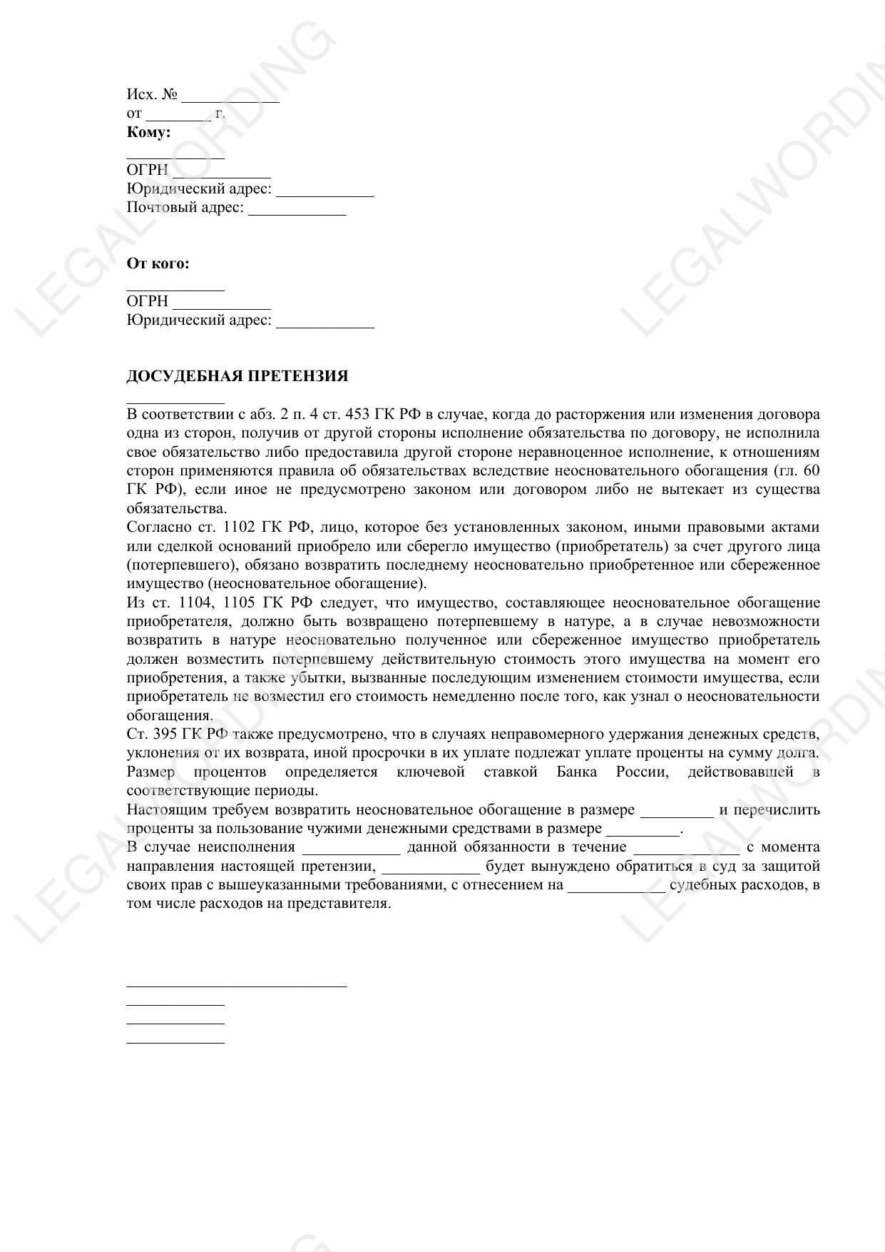 Шаблон досудебной претензии о неосновательном обогащении поможет направить претензию должнику с требованием вернуть неосновательно обретенное имущество или его стоимость.