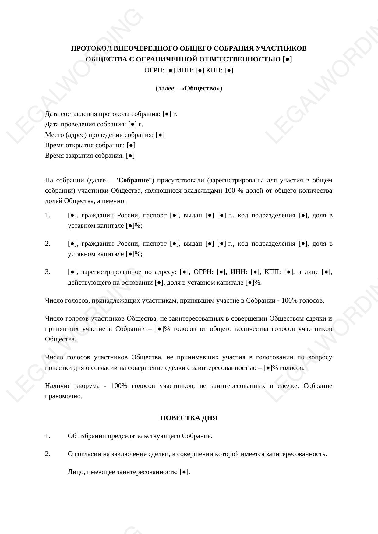 Протокол внеочередного общего собрания участников необходим для официального оформления согласия на сделку, в совершении которой имеется заинтересованность. Согласно Федеральному закону "Об обществах с ограниченной ответственностью", сделкой с заинтересованностью признается сделка, в совершении которой имеется заинтересованность члена совета директоров, единоличного исполнительного органа, члена коллегиального исполнительного органа или контролирующего лица общества.