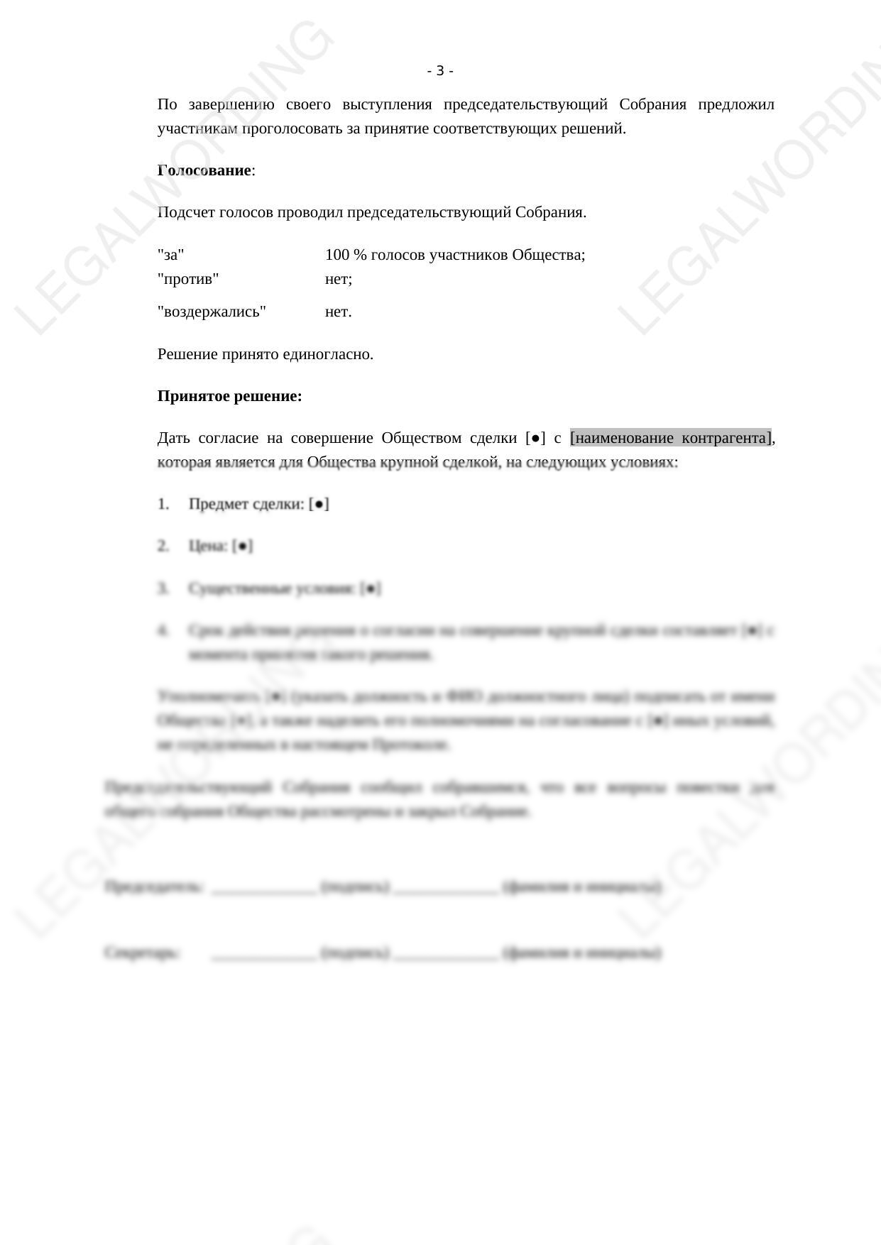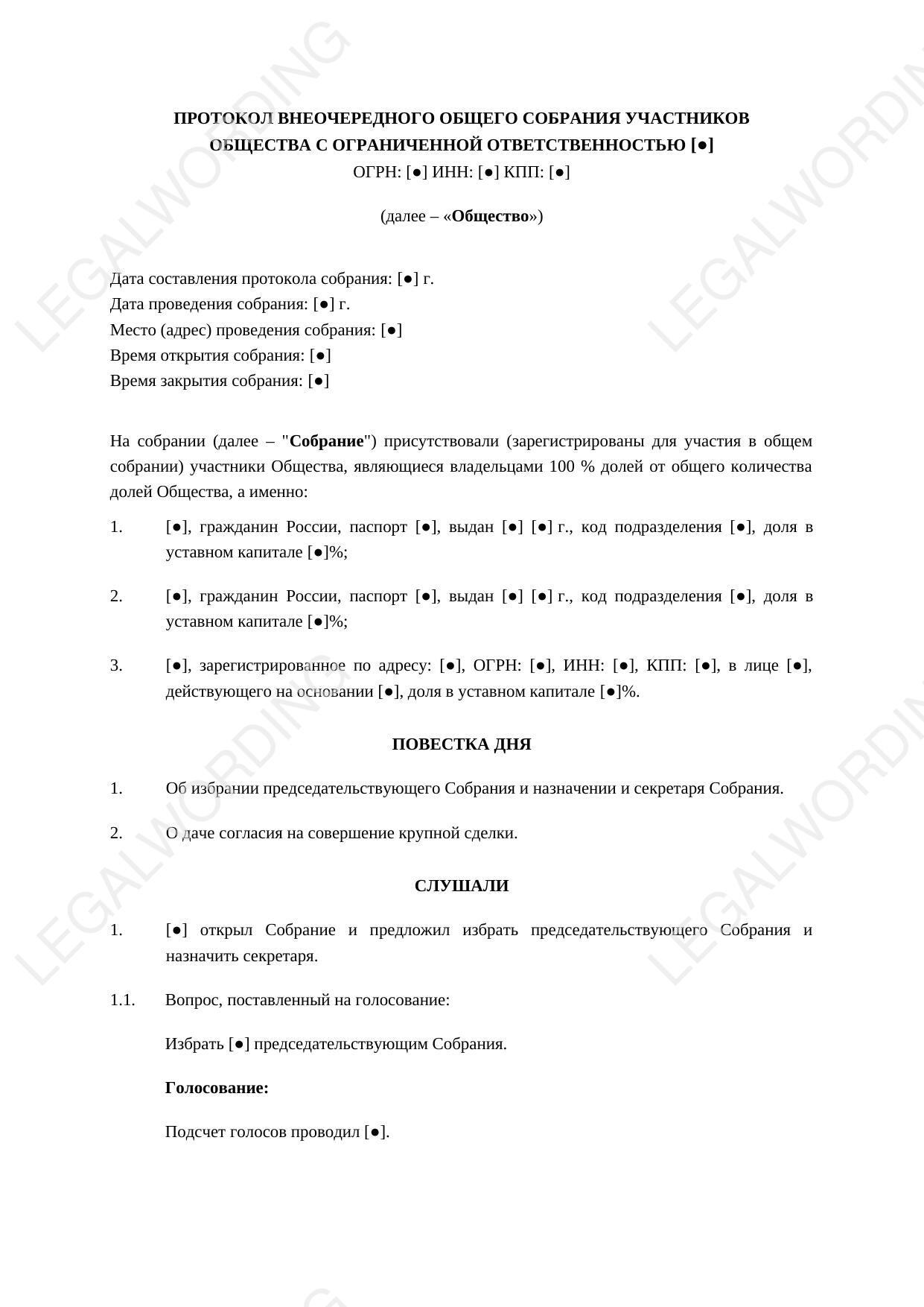 Протокол общего собрания участников об одобрении крупной сделки — обязательный документ для законного совершения сделок, превышающих 25% балансовой стоимости активов общества и выходящих за рамки обычной хозяйственной деятельности.