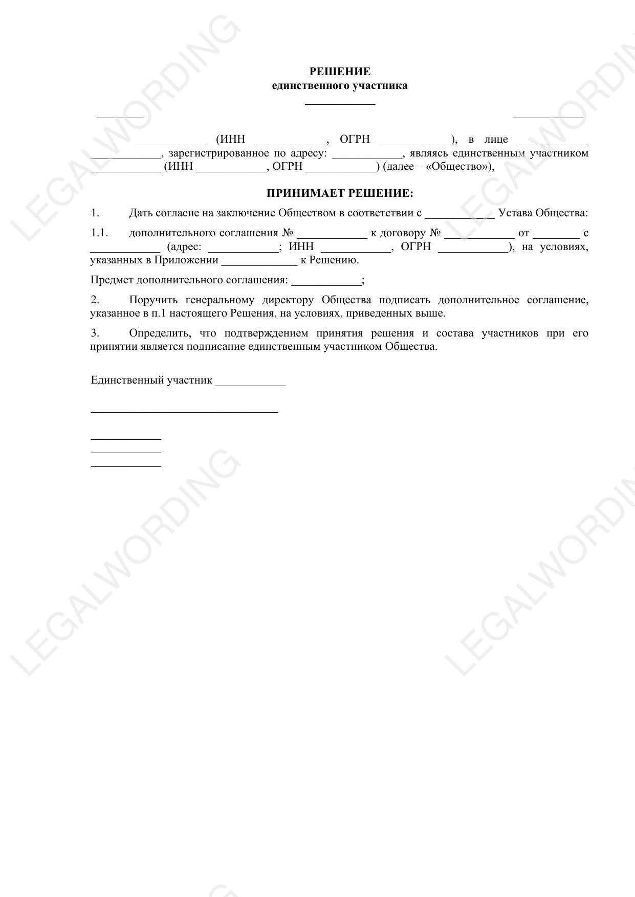 Шаблон решения единственного участника организации. Данный шаблон предназначен для использования единственным участником общества с ограниченной ответственностью, который принимает решение по важным вопросам деятельности общества, включая принятие дополнительных соглашений и заключение новых договоров.