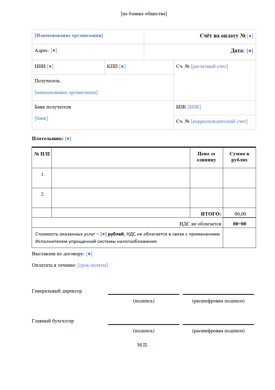 В счете фиксируются реквизиты сторон (наименование, адрес, ИНН/КПП), банковские данные получателя (банк, БИК, корреспондентский и расчетный счета), номер и дата счета, плательщик, основание (договор), фактурная часть с позициями и итогами, срок оплаты, а также подписи ответственных лиц.