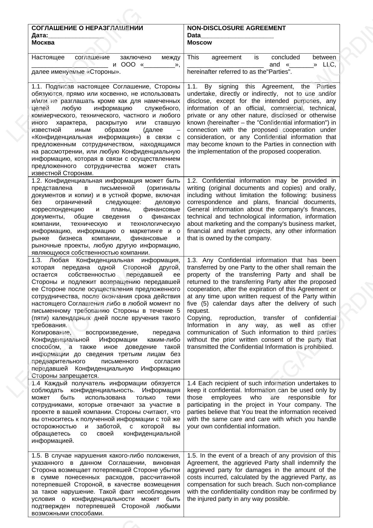 Соглашение о неразглашении конфиденциальной информации (NDA) на русском и английском языке. Короткий вариант условий, для несложных взаимоотношений и предотвращения избыточного регулирования.
