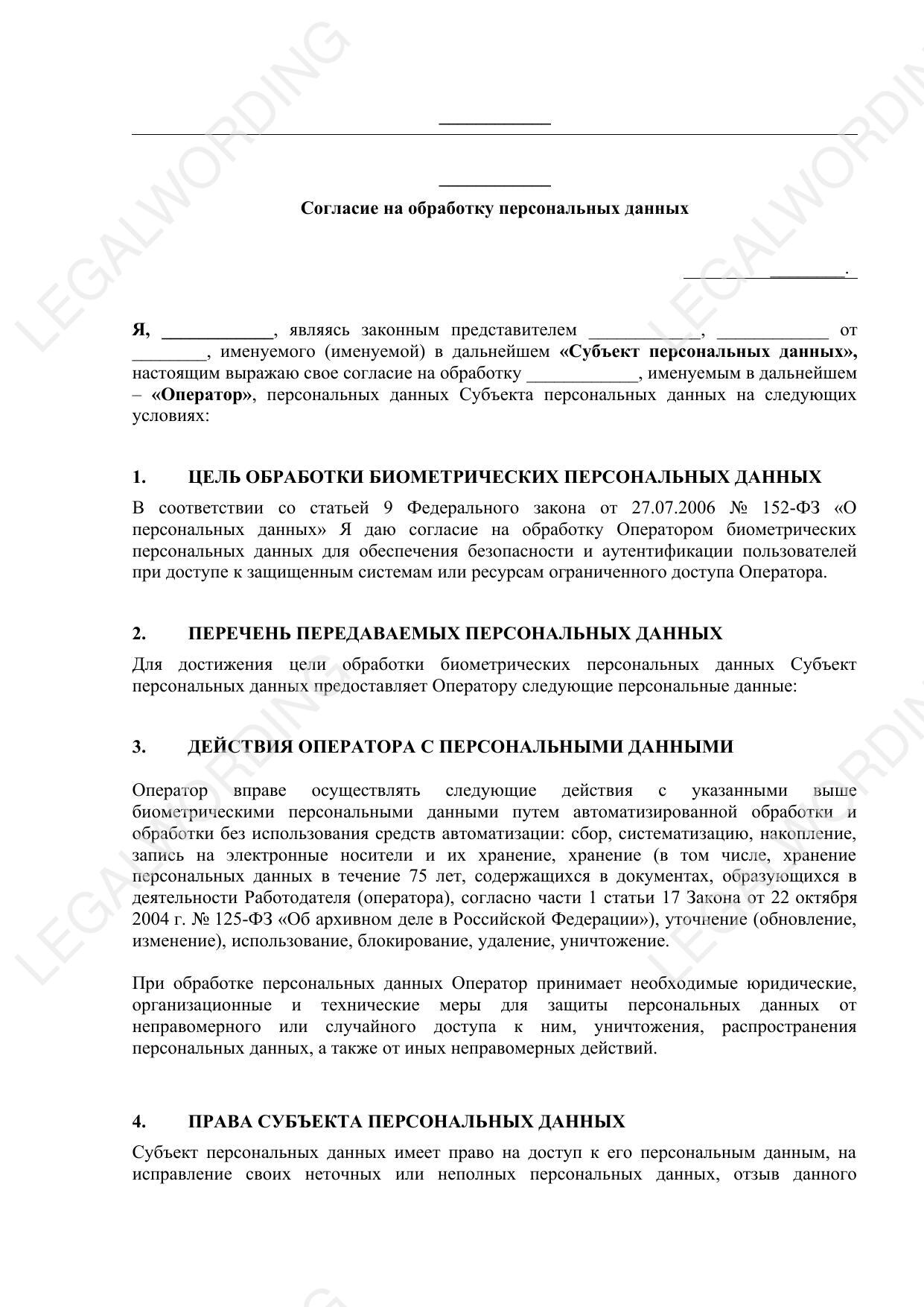 Шаблон согласия на обработку биометрических персональных данных предназначен для использования, когда юридическое или физическое лицо (Оператор) обрабатывает биометрические данные другого физического лица (Субъекта персональных данных) для обеспечения безопасности и аутентификации. Документ включает ключевые разделы: