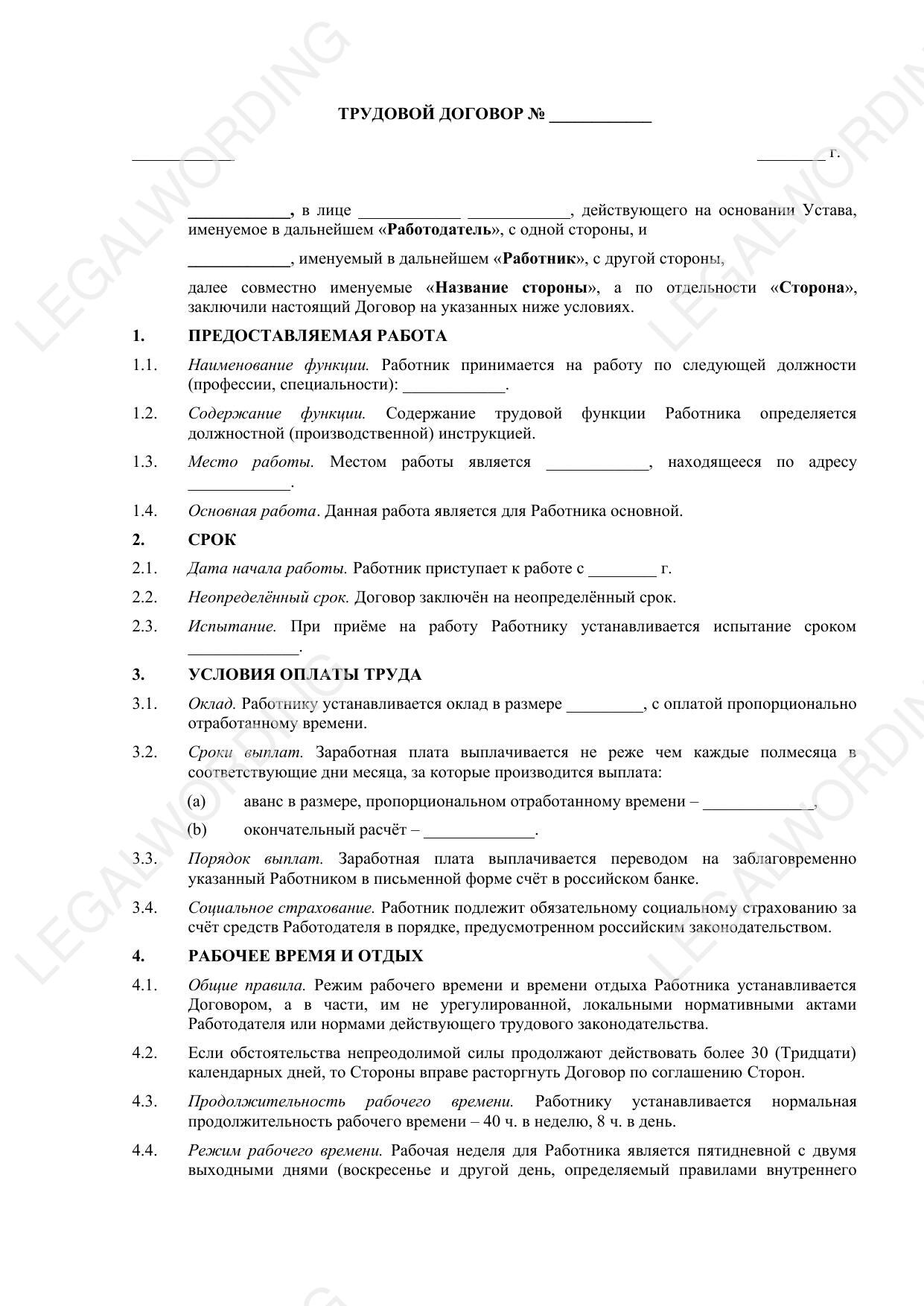 Шаблон трудового договора, заключаемого между работодателем и работником, предназначен для оформления трудовых отношений с учетом требований российского законодательства.