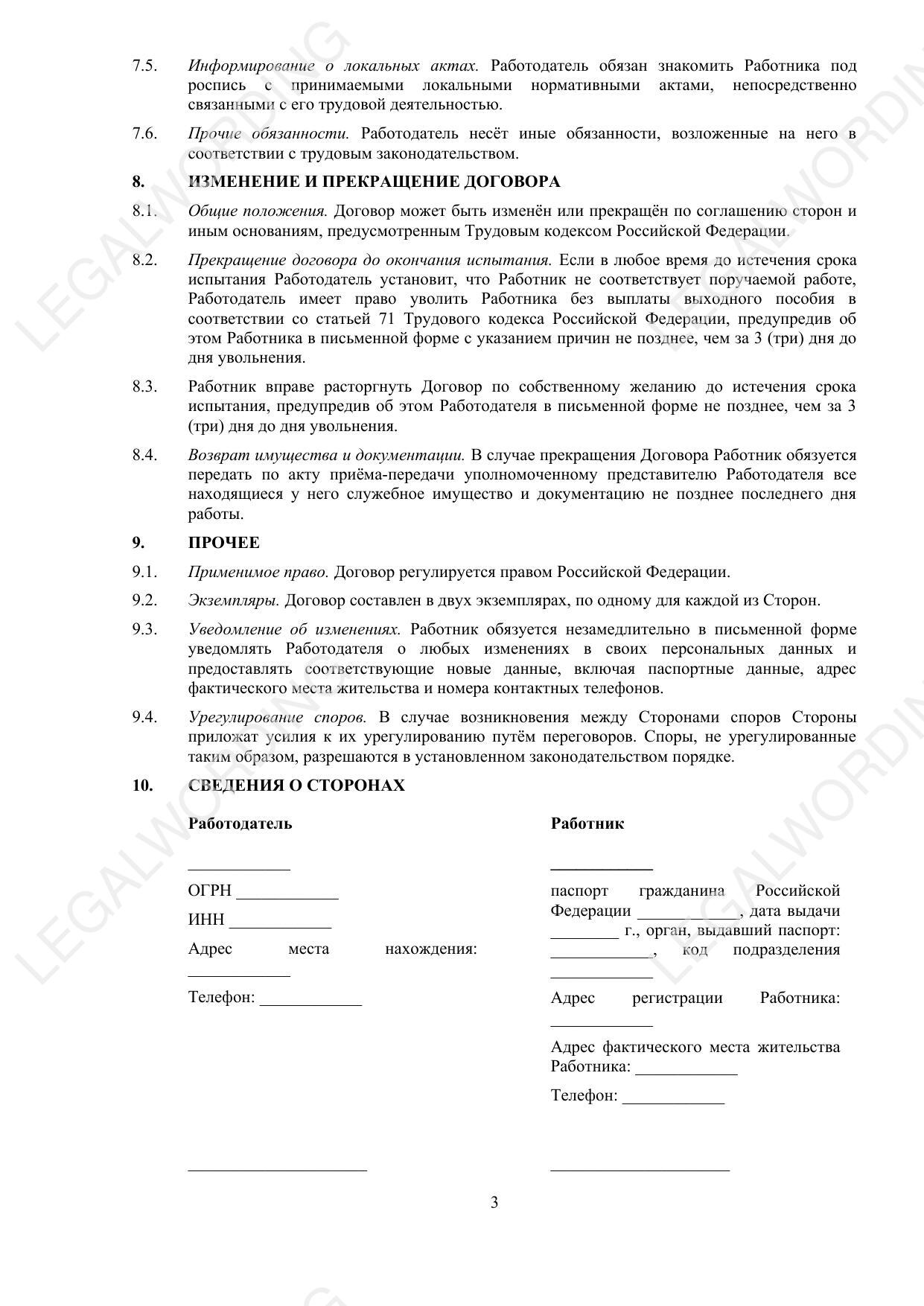 3. Срок действия договора - дата начала работы, условия испытательного срока и возможность его продления.