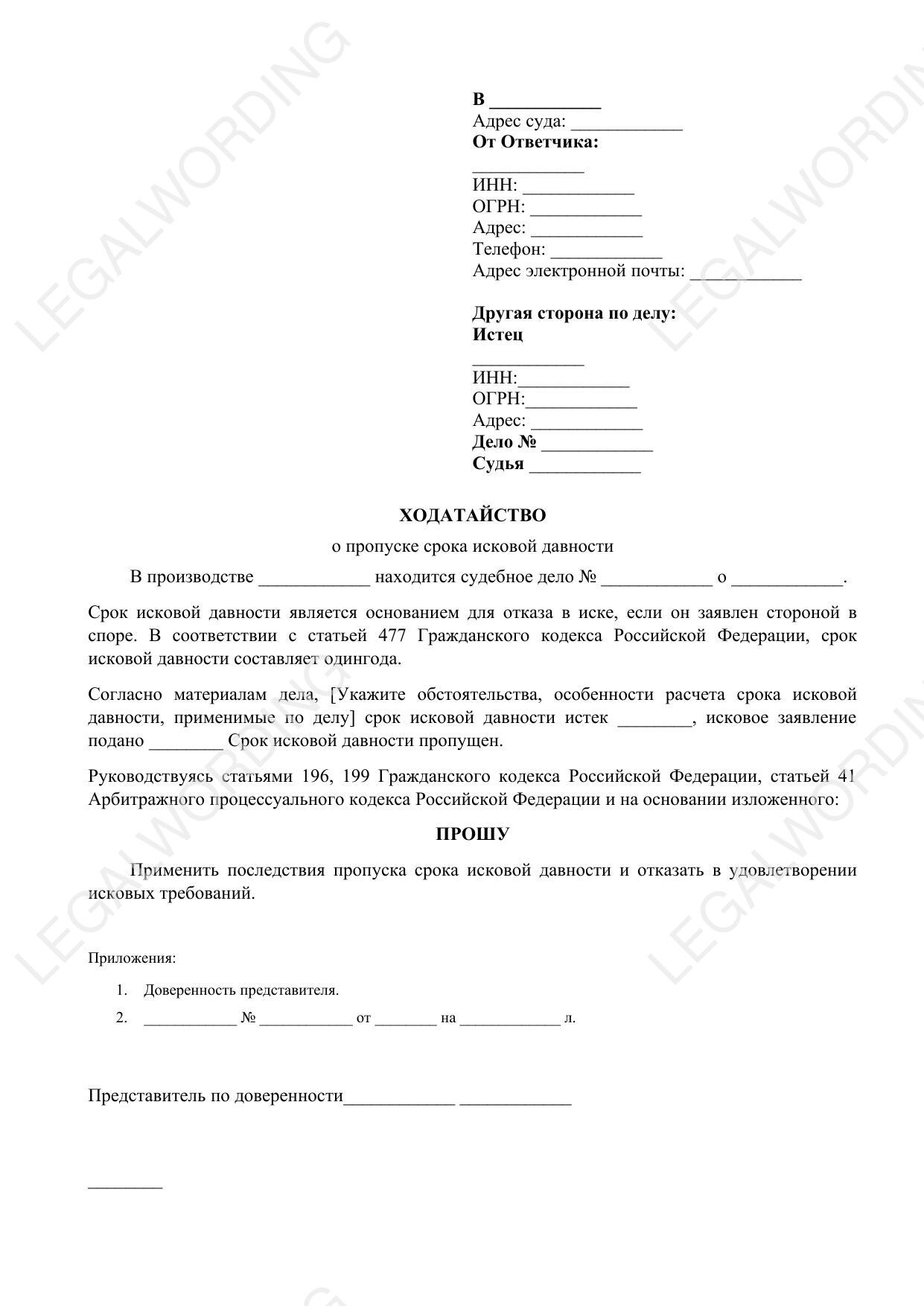 Шаблон ходатайства о пропуске срока исковой давности, используемый в судебных разбирательствах между юридическими лицами и индивидуальными предпринимателями. Данный шаблон позволяет грамотно оформить ходатайство о применении последствий пропуска срока исковой давности, что может стать основанием для отказа в удовлетворении исковых требований. Документ включает в себя следующие ключевые разделы: