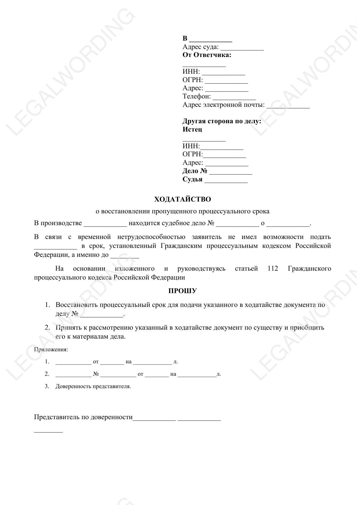 Шаблон ходатайства о восстановлении пропущенного процессуального срока, предназначенный для использования юридическими лицами. Документ включает основные разделы, необходимые для эффективного обращения в суд: