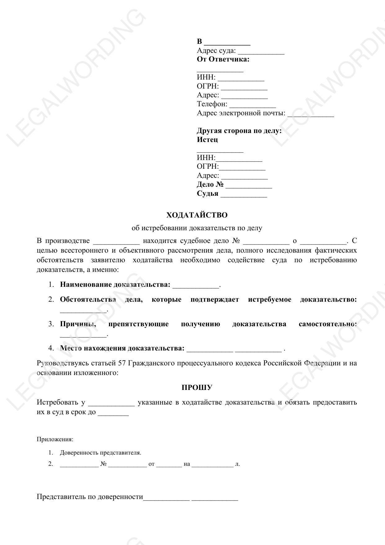 Шаблон ходатайства об истребовании доказательств по делу может быть использован юридическими лицами в процессе судебных разбирательств. Этот документ формируется с целью содействия суду в получении необходимых доказательств для объективного рассмотрения обстоятельств дела. Шаблон включает в себя следующие основные элементы: