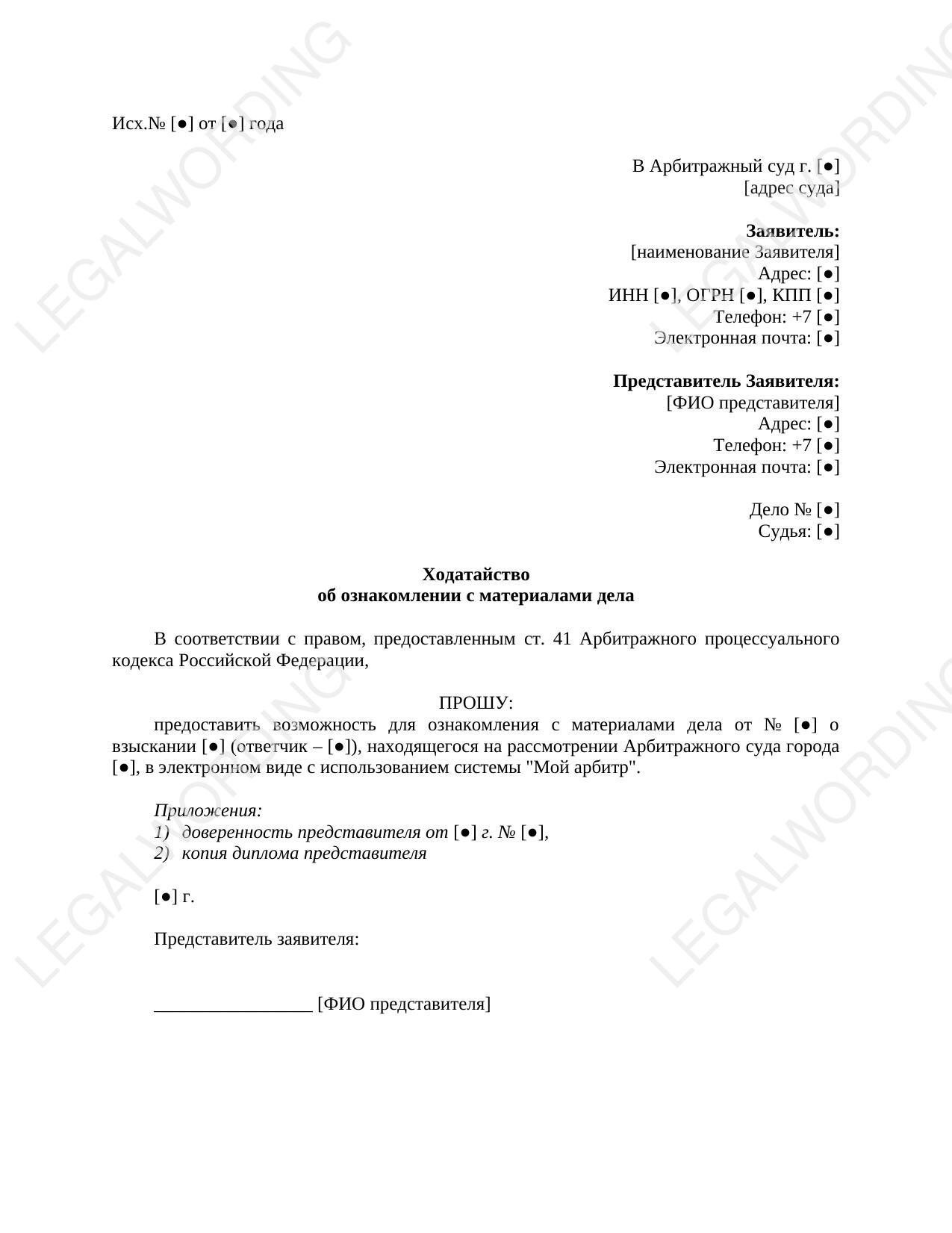 Документ содержит все необходимые реквизиты: адресат (суд), данные заявителя (юридического лица) и его представителя, номер дела, судью, четкое изложение просьбы (ознакомиться с материалами конкретного дела в электронной форме) и ссылку на процессуальную норму (ст. 41 АПК РФ). К ходатайству прилагаются документы, подтверждающие полномочия представителя (доверенность).
